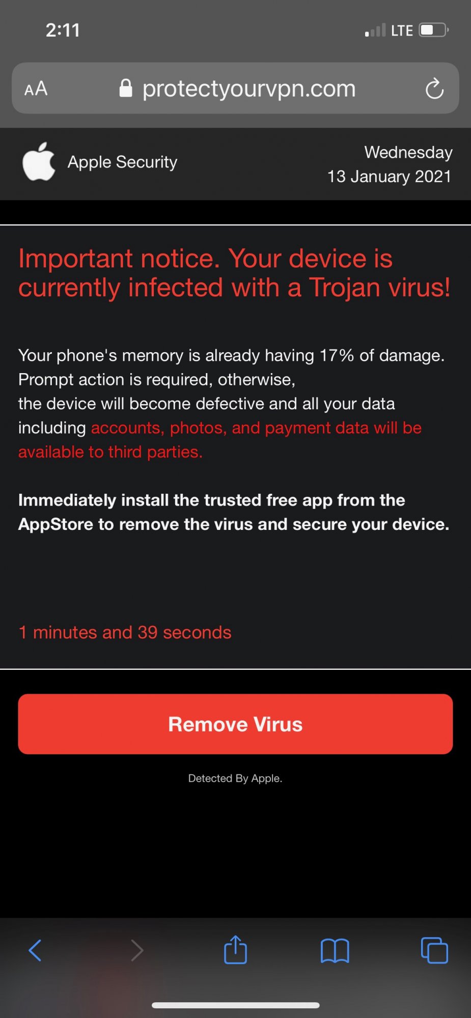 Apple_Robert Contributor Sep 21, 2012 37,155 56,586 In a van down by the river Jan 13, 2021 #2 Bogus advertisement meant to trick someone into purchasing a VPN. She should use an adblocker. Reactions: ericwn