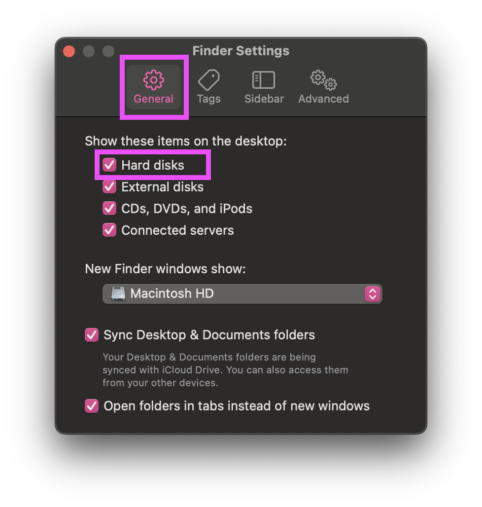 & how do I get the Mac HD to show in the Finder & Desktop & windows like normally?