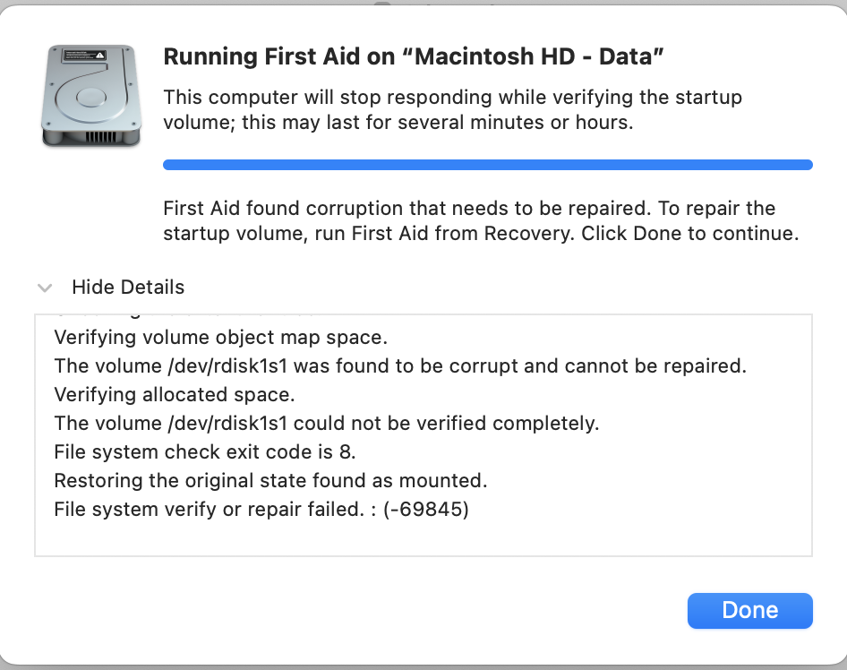 I've tried running First Aid multiple times, even in recovery and internet recovery mode, but unfortunately, it failed every time. I really don't want to erase everything and start over with a backup, as that might be my last resort.