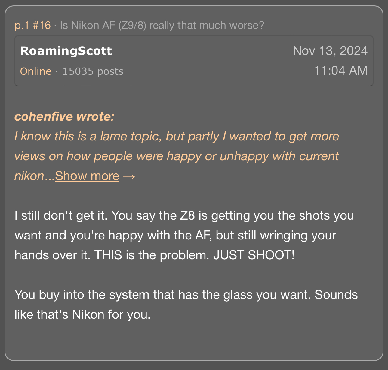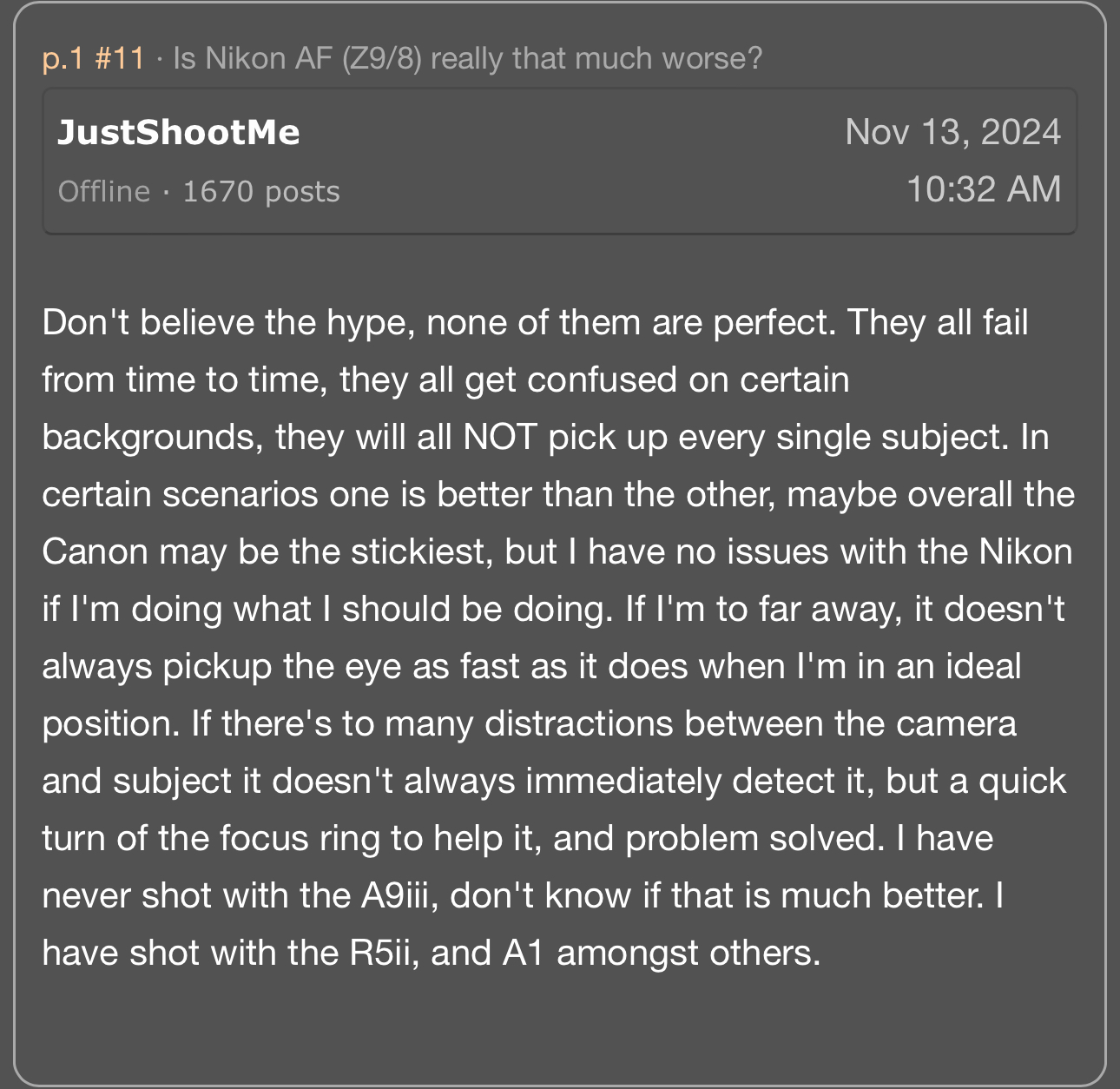 Your mention of Zebras reminds me that, yes, Sony makes it quite simple and convenient to use this method as one way of monitoring and nailing correct exposure..... I was surprised rather a while ago when in another forum I kept referring to using Zebras and the people on that forum obviously didn't get what I was talking about. We all muddled around for a bit trying to figure out what was causing our apparent lack of communication until finally at last things became clear. There was good reason for that confusion. At least back then (and possibly still now, I don't really know) Nikon did not utilize the Zebras thing, or or if they did it certainly was a mystery to many Nikon Z series users and apparently wasn't nearly as convenient as it is with Sony. I don't know about Canon's approach to this.The A1ii is twice the price of the A7RV here. Even when I bought the A7RV the A1 was a lot more expensive and the A7RV had some advantages. I got a lens for the difference in price. Anyway, I don't really need the speed of the A1.