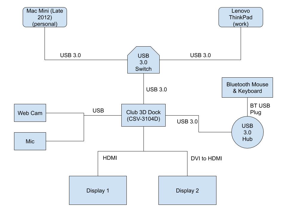 I want a quick and easy solution to switch between sources. In order to do so, I would need to make sure that all the peripherals are connected to the dock and not either computer. My thought was that if I get a 2-1 USB 3 switch (NOT SPLITTER OR HUB) I should be able to quickly switch between the permanent USB 3 connection on the mac mini and the desktop USB 3 plug for my windows laptop. The laptop needs to stay portable as I sometimes travel for work and am planning on hiding the mac mini under my desk to keep a clean look on the desk top (ironically my windows desktop is a disaster right now). So this leads me to issue #2…