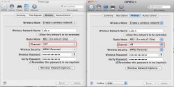 NOTE: if you elect to do the above with your newer, dual-band AEBS, make sure to give each network a different name (SSID). So say for example, the 802.11n 5.0GHz SSID is "Speedy n", and the 2.4GHz is called "Crawler n/b/g" -on the older AEBS (upstairs), extending the "n" network, you would have the identical setup, same network name - "Speedy n", same password, security, BUT you would set them on DIFFERENT channels. See pic below: