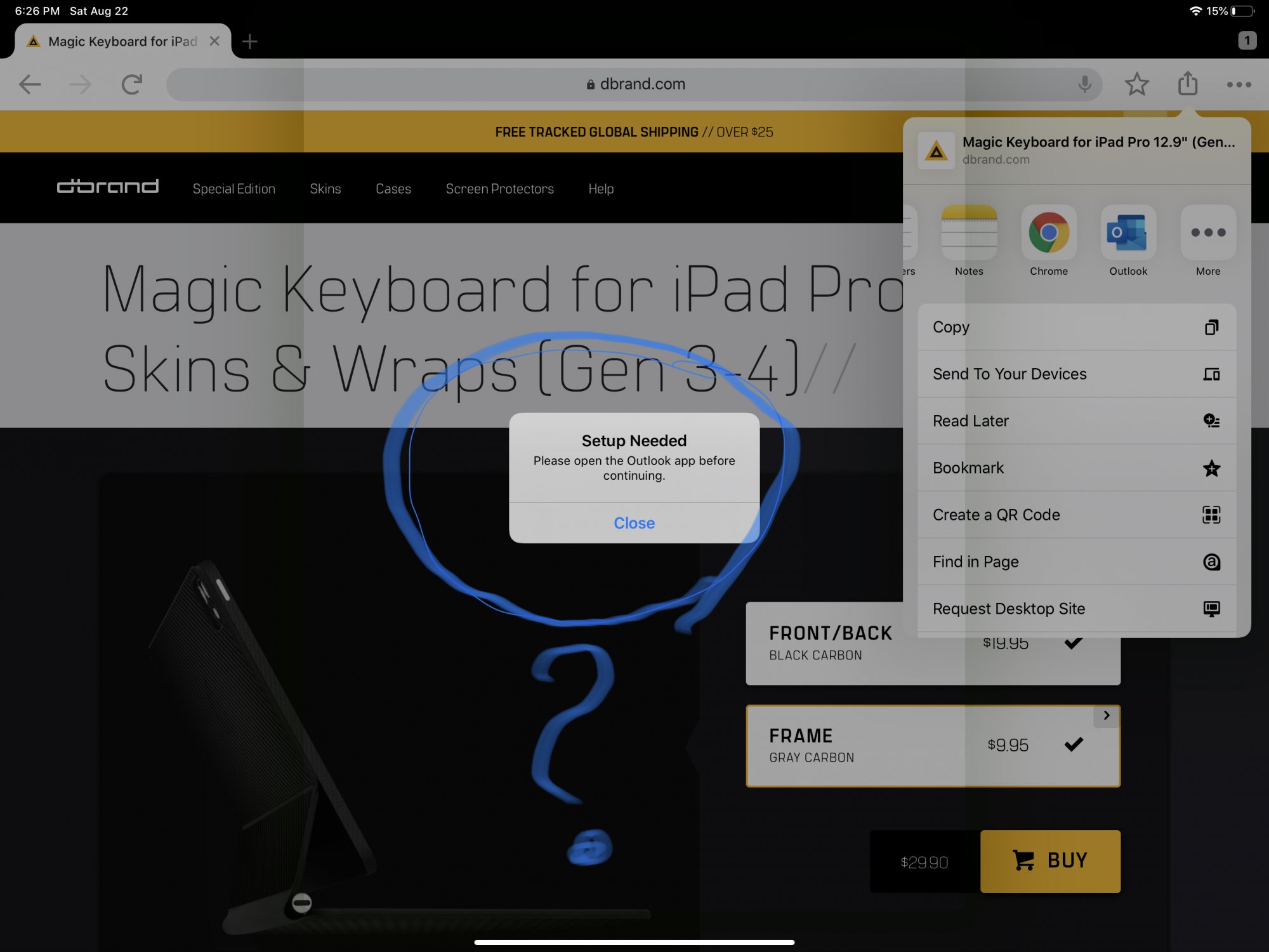 Just got a iPad Pro 12.9 and I am having an issue when trying to send and email using outlook. When on chrome I want to share a web page via email but I get this error saying open outlook app 1st to setup, I looked all over and I have no idea what needs to be set up. Everything seems ok.. Help please anyone? I don’t want to install the gmail app ...