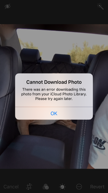 I get this error message every time I try to open up a photo on my iPhone that is more than a couple days old. It has been doing this for months now. It only does it when I'm NOT connected to wifi. If I'm on wifi, all of my images download to the device just fine. And FYI I do have iCloud "photo optimization" turned ON.