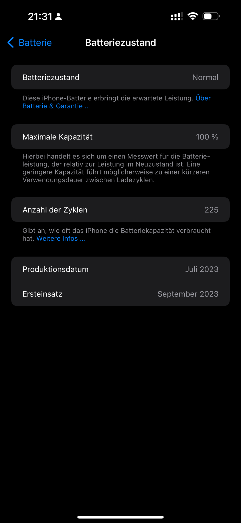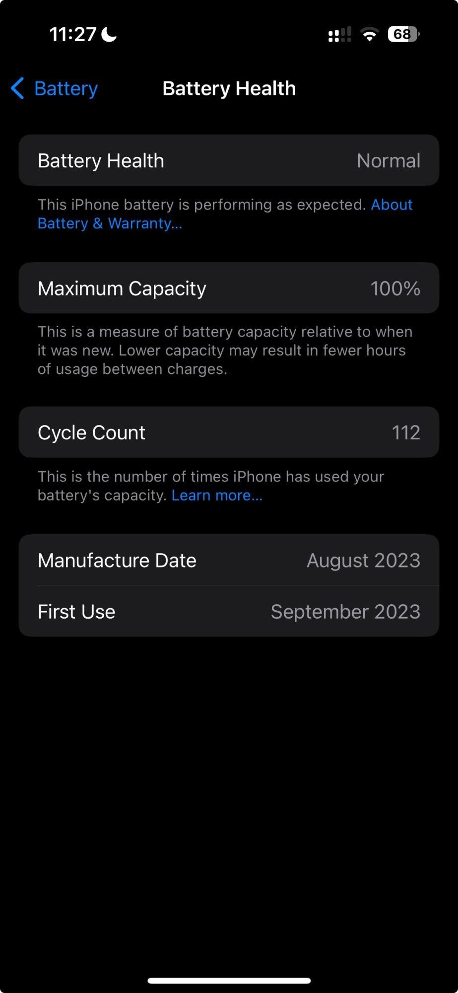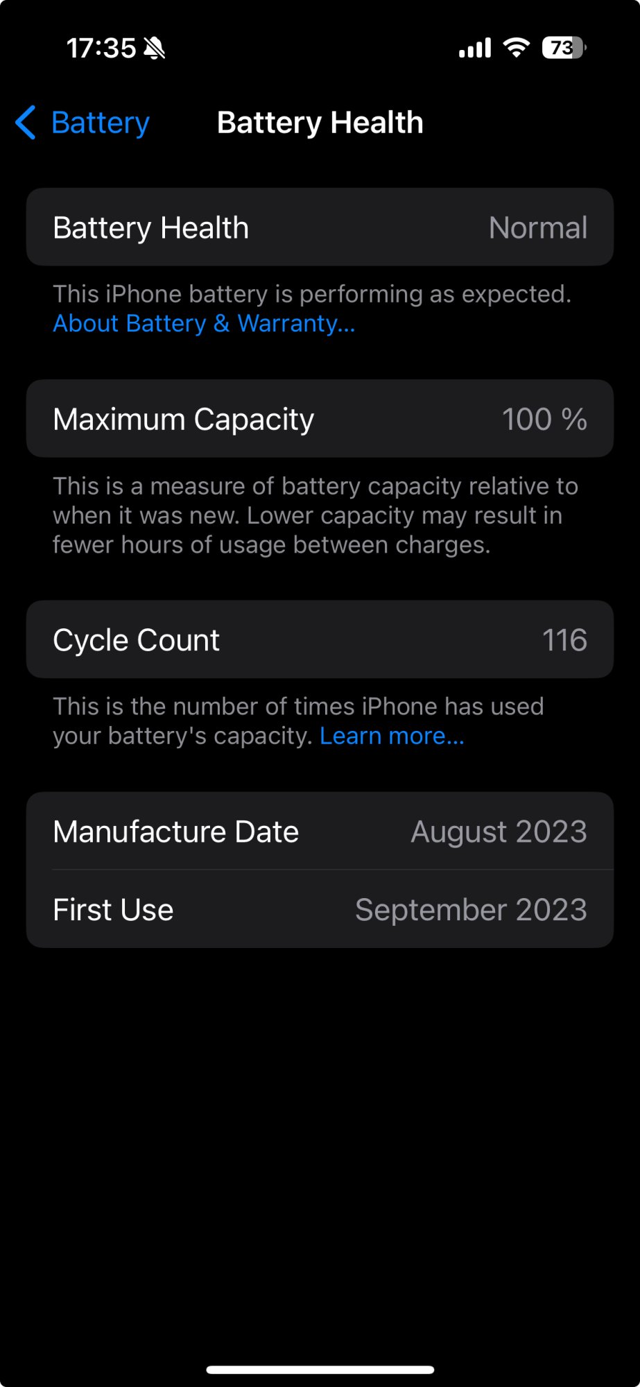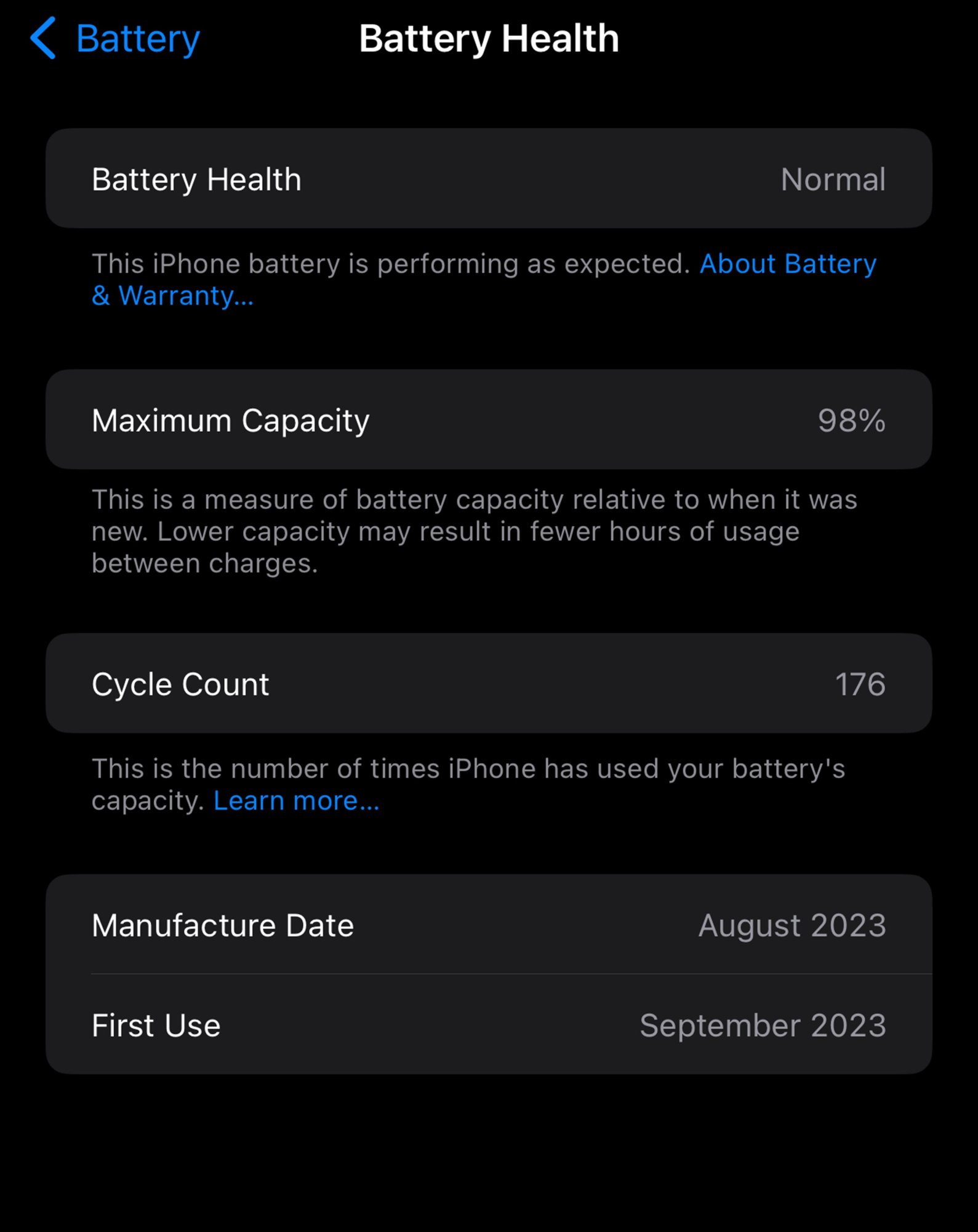 - Check the readout next to "Battery Health." For more details including your device's battery cycle count, manufacture date, and first use date, simply tap the readout. (In earlier versions of iOS 17, this information was hidden in the General ➝ About section of the Settings app).