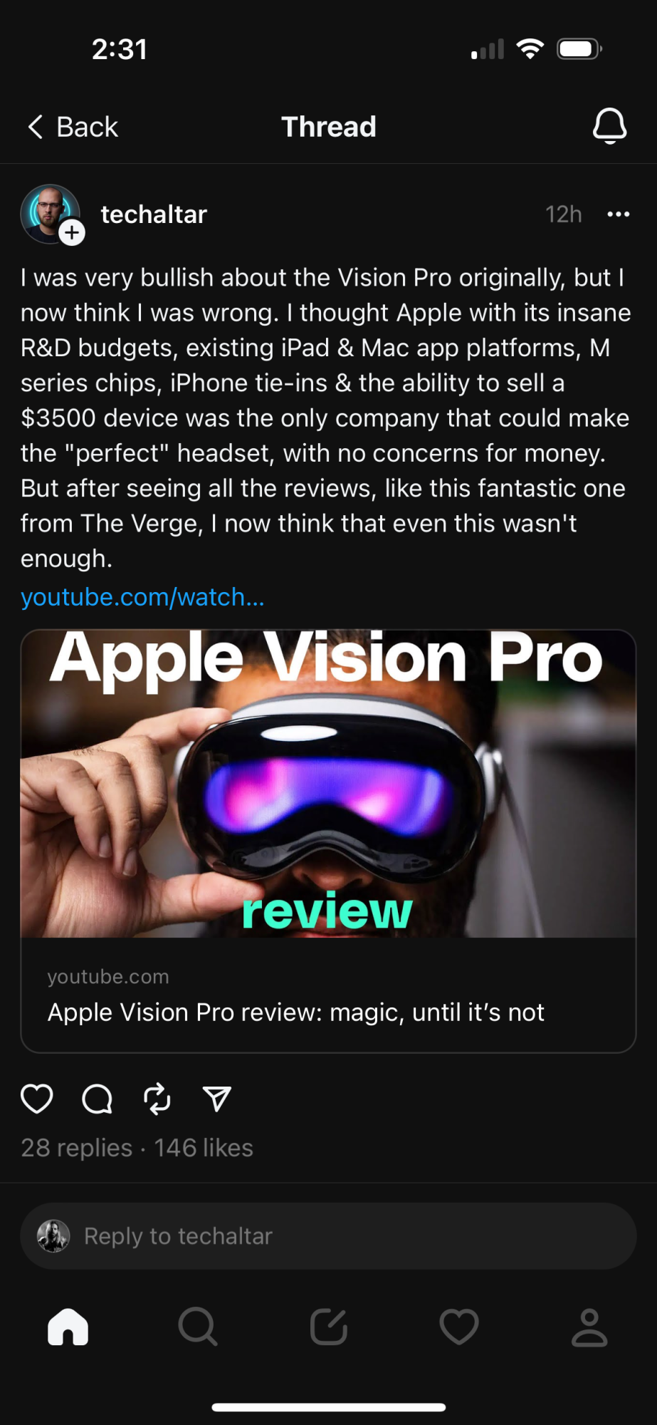 The thing is, the AVP doesn’t solve any of the technical issues that prevents us from building true-AR smart glasses and contact lenses. Apple also didn’t create this vision of the future, it’s been there since the 90s. So what’s the point? This is an incrementally better version of the Quest, but also worse for gaming and exercising, and very expensive. To repeat, it doesn’t solve any of the fundamental issues that existing VR headsets exhibit.