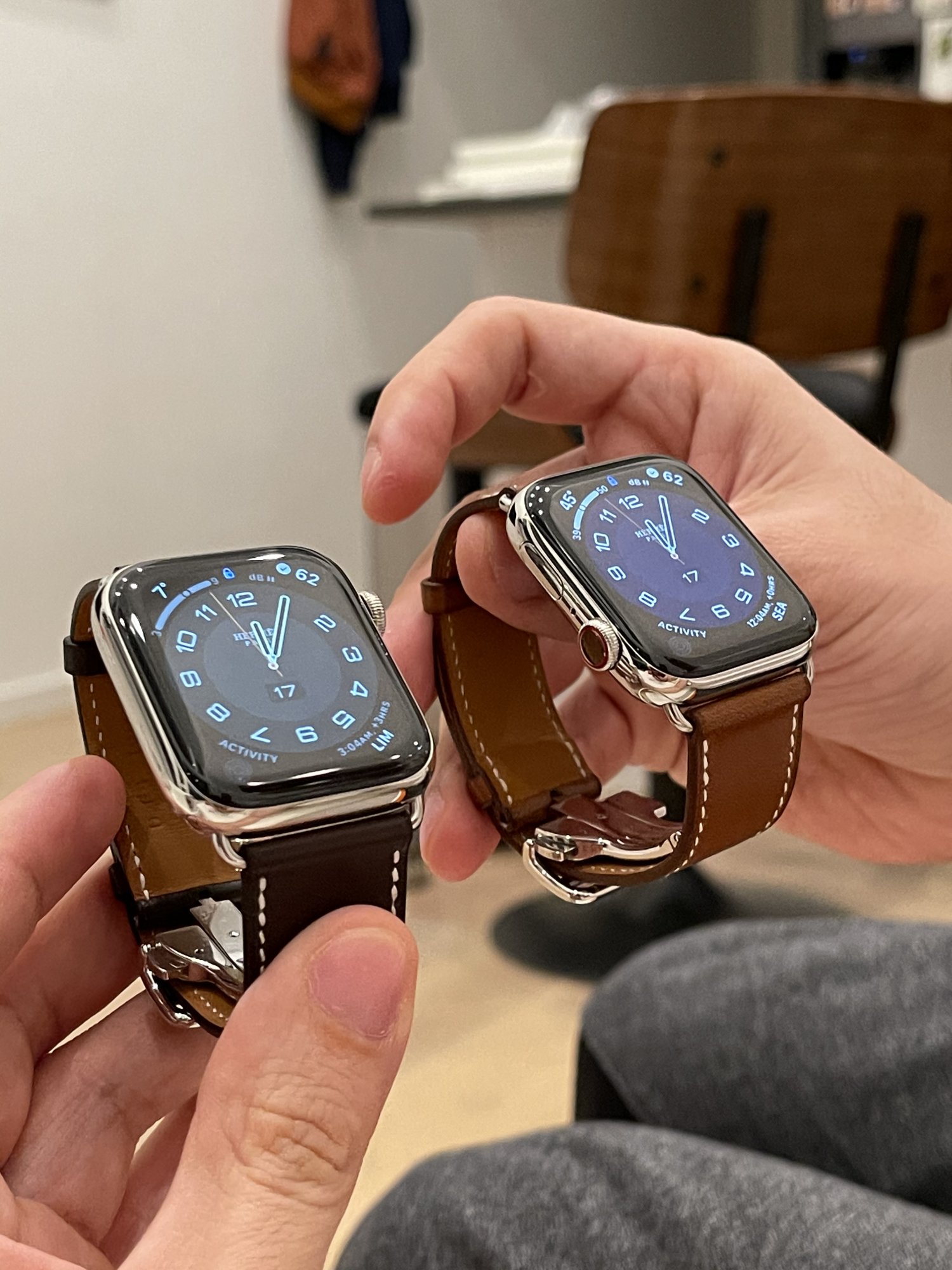 Welcome to our precious club. You will not regret the SS version. It is the most classy combination you will get with any leather band.Excited to be in this club! I just ordered the 40mm Silver SS Hermès with the Attelage Orange Double Tour band. I’ve had every series watch since series 0. I’ve had stainless and aluminum. I really wanted the blue aluminum but I am concerned about how that will look when I get a chance to wear clothes that aren’t sweats😒.