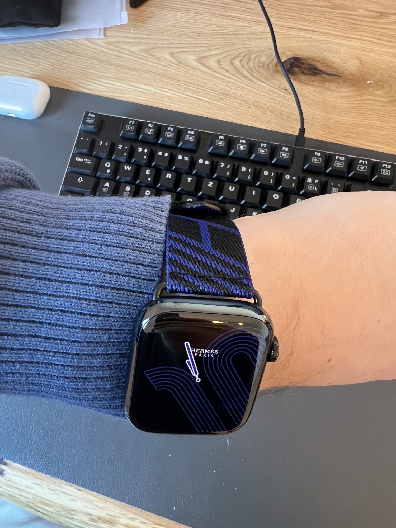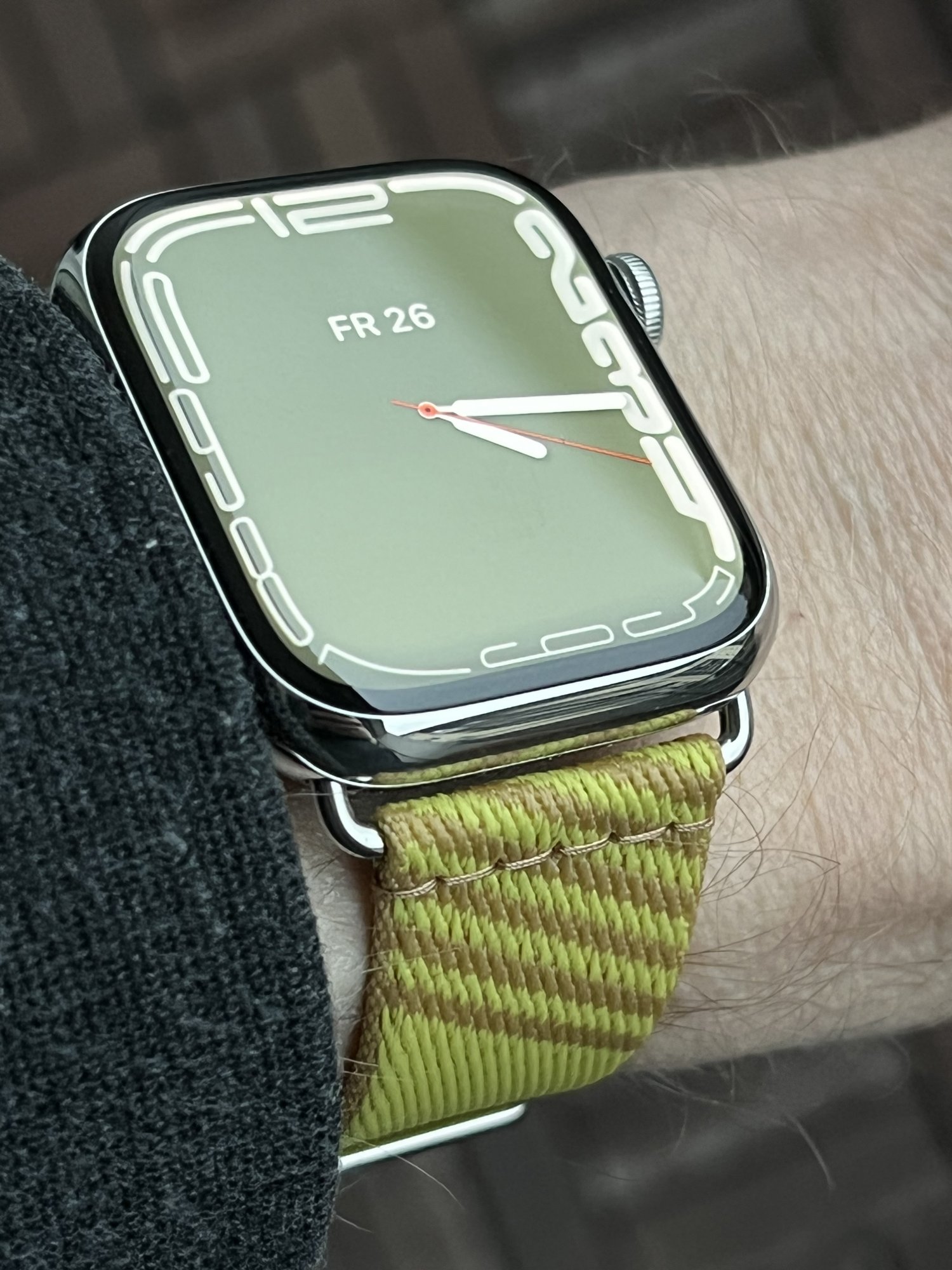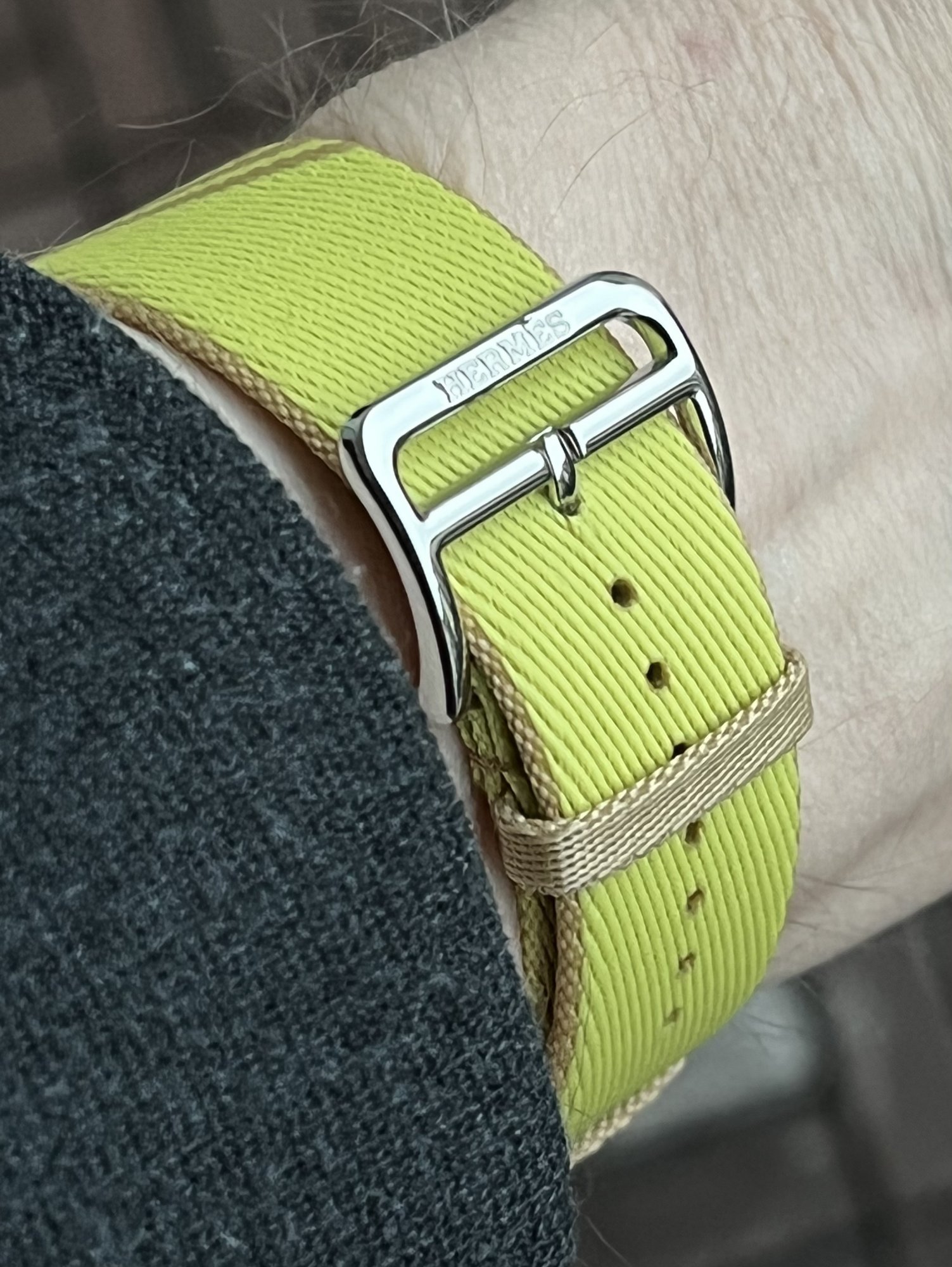 I had originally intended to get the new Swift Lime leather strap, but as that one turned to be (in my eyes) inferior in colour and leather type to the older Epson Lime strap (which I‘ll keep hunting on ebay), I ended up getting the Kraft/Lime Jumping band instead. It is bright and subtle at the same time and I like it very, very much. I always enjoyed the Woven bands from Apple (and still have almost 20 of those), but the Hermès nylon strap is in a whole different class.