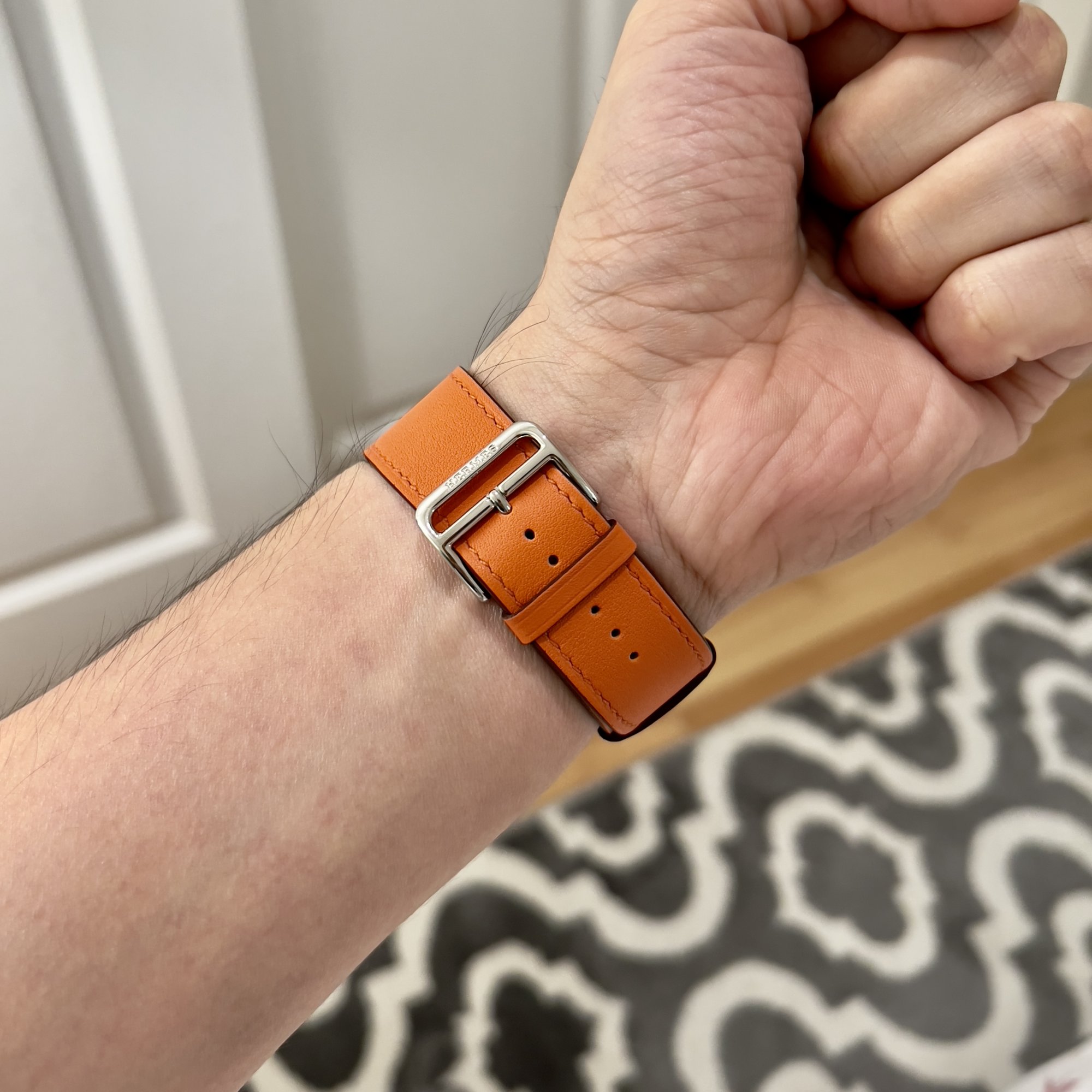 The orange looks great! Love the black as wellLove the color, but this one came defective. The strap is too thick that you have to push hard to make it fit on the buckle. This would damage the leather a way sooner.