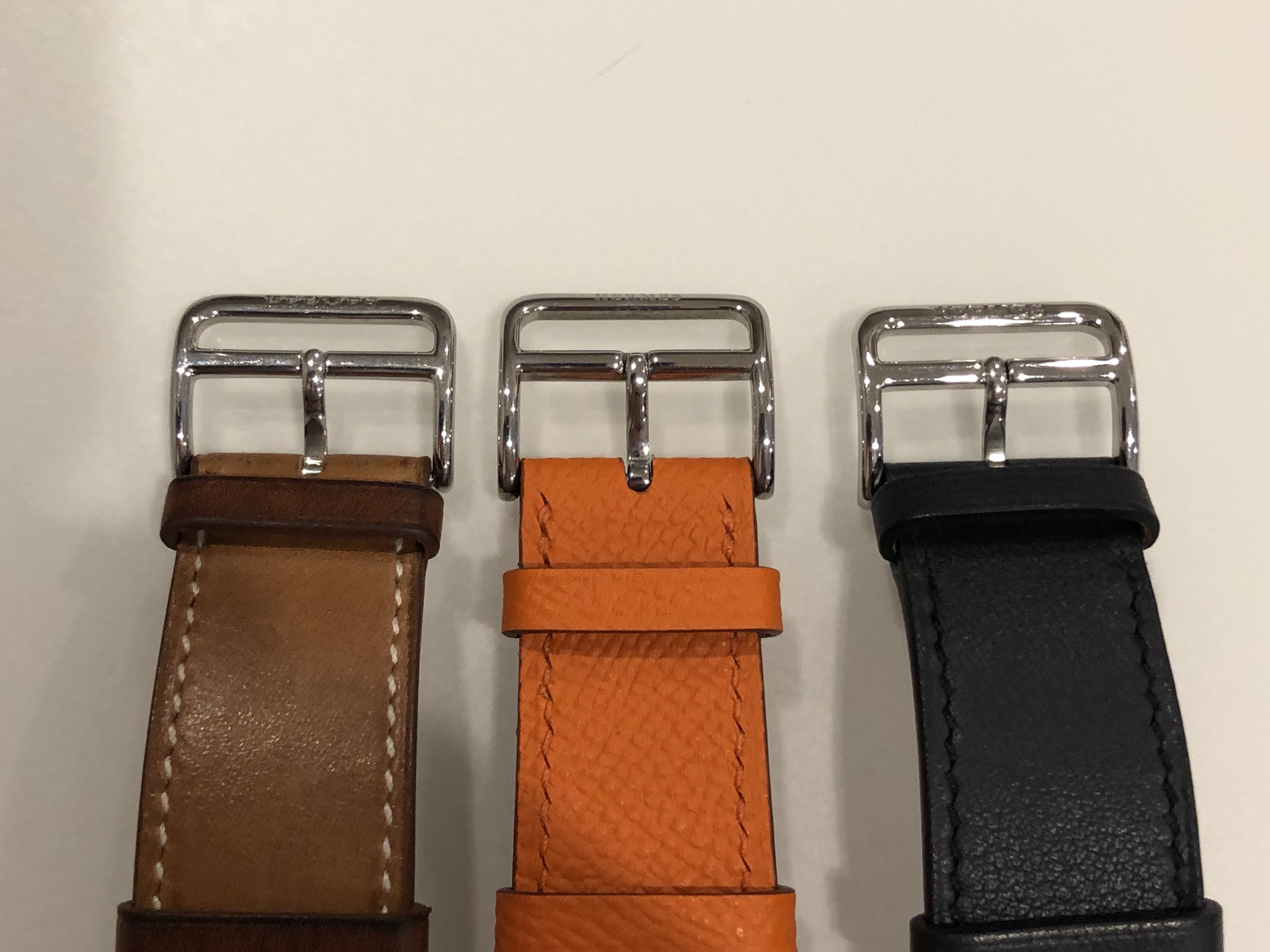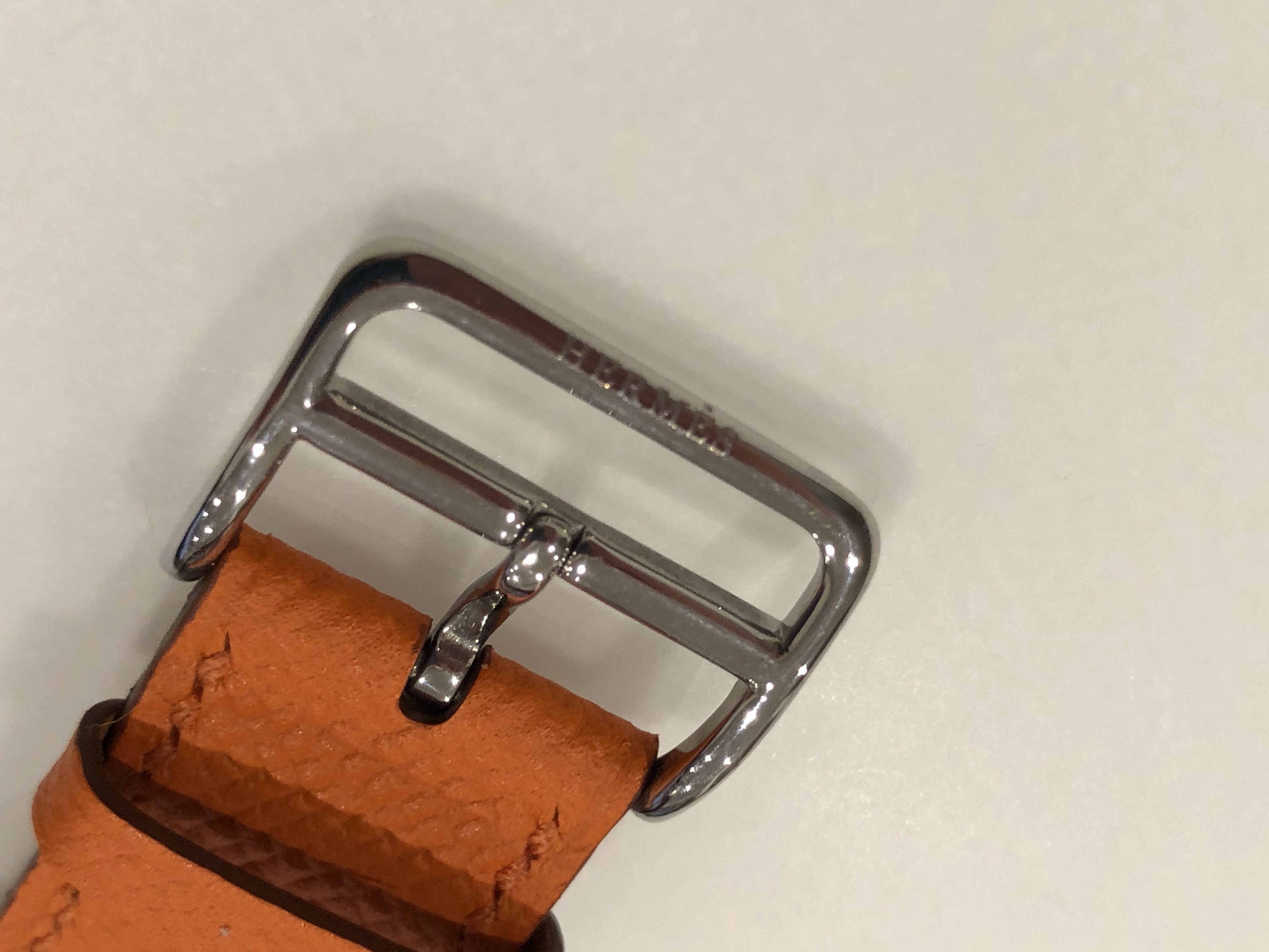 Buckle: There is engraving of Hermès on the buckle, but the fonts are smaller, and the indents are shallower than the genuine one. The actual buckle is also thinner. However, the latch which passes through the hole in the band is not as sturdy and can be twisted from side to side.