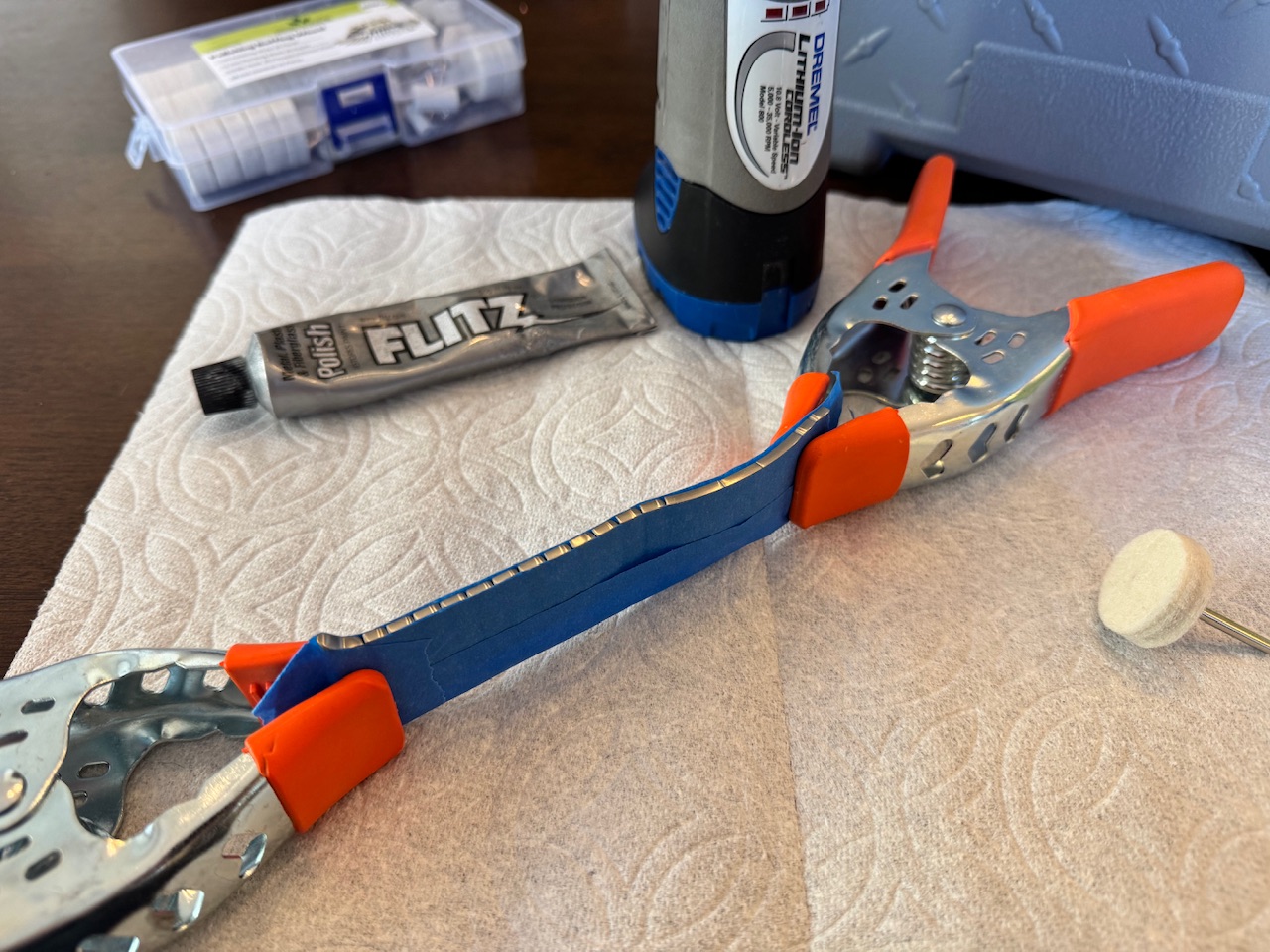 I first attached all of my spare links back onto the bracelet, then separated half of the links and set them aside before masking the remaining half of the bracelet with painters tape. I used two clamps to hold the exposed edge of the bracelet upright and used Flitz polish with my Dremel and a polishing wheel. I repeated this process three more times for the rest of the bracelet.
