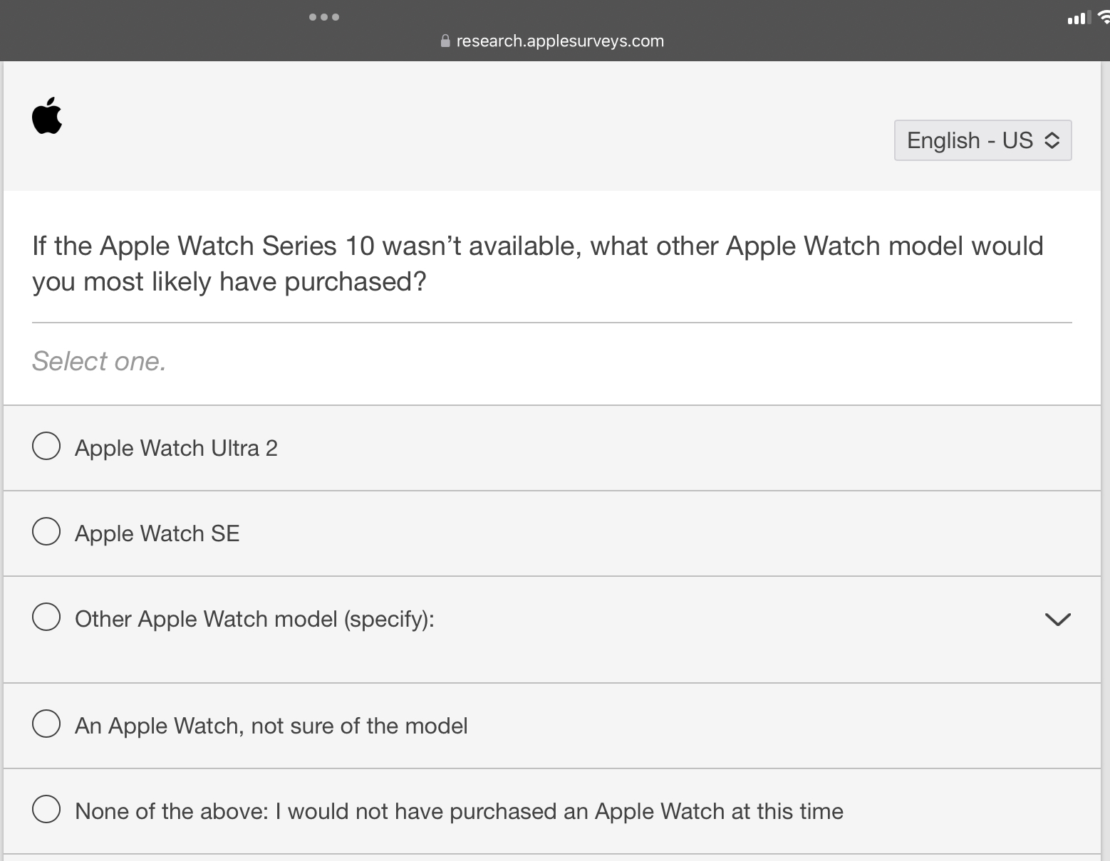 I had a similar survey when I bought my Series 9. I also was of the same of mind that I wondered if Apple is trying to gauge if they need to cut out the “middle” tier and have only the SE and then the Ultra.Apple sent a survey today about my S10 purchase.