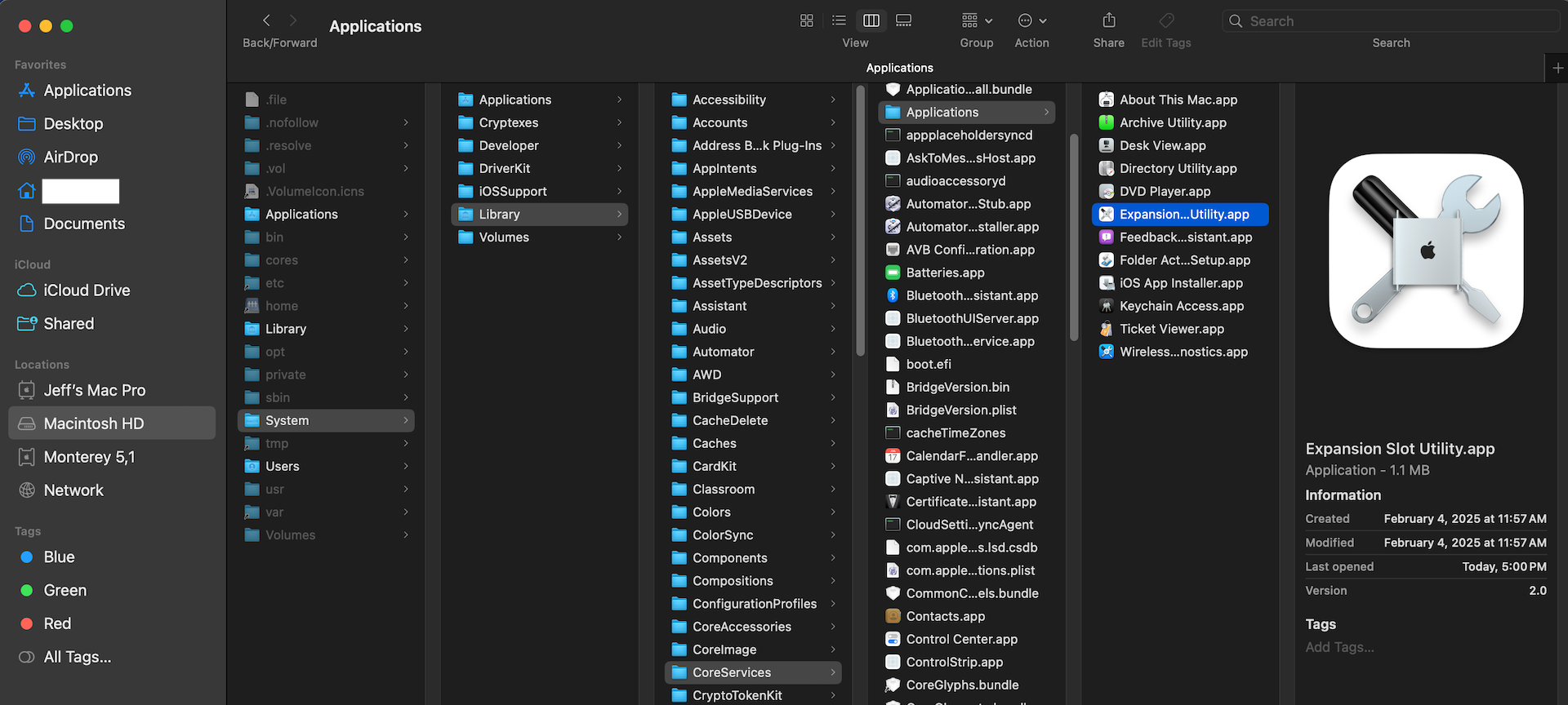Anyway, in the article it mentions the Expansion Slot Utility app. Huh? where's that on my machine, I asked myself? It's not in the easily accessible Applications folder, it's not in the Utilities folder. That's because it's hidden along with 11 other utilities, see screenshots.