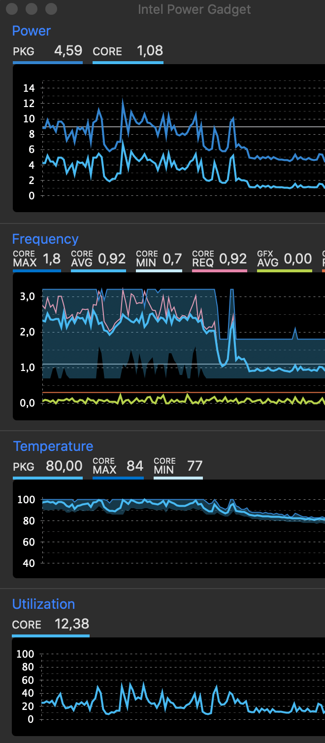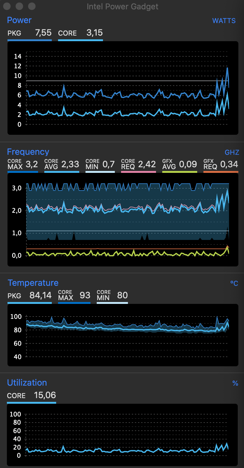 When I have 30% core utilization, macbook is silent and package power is about 5-6 W...