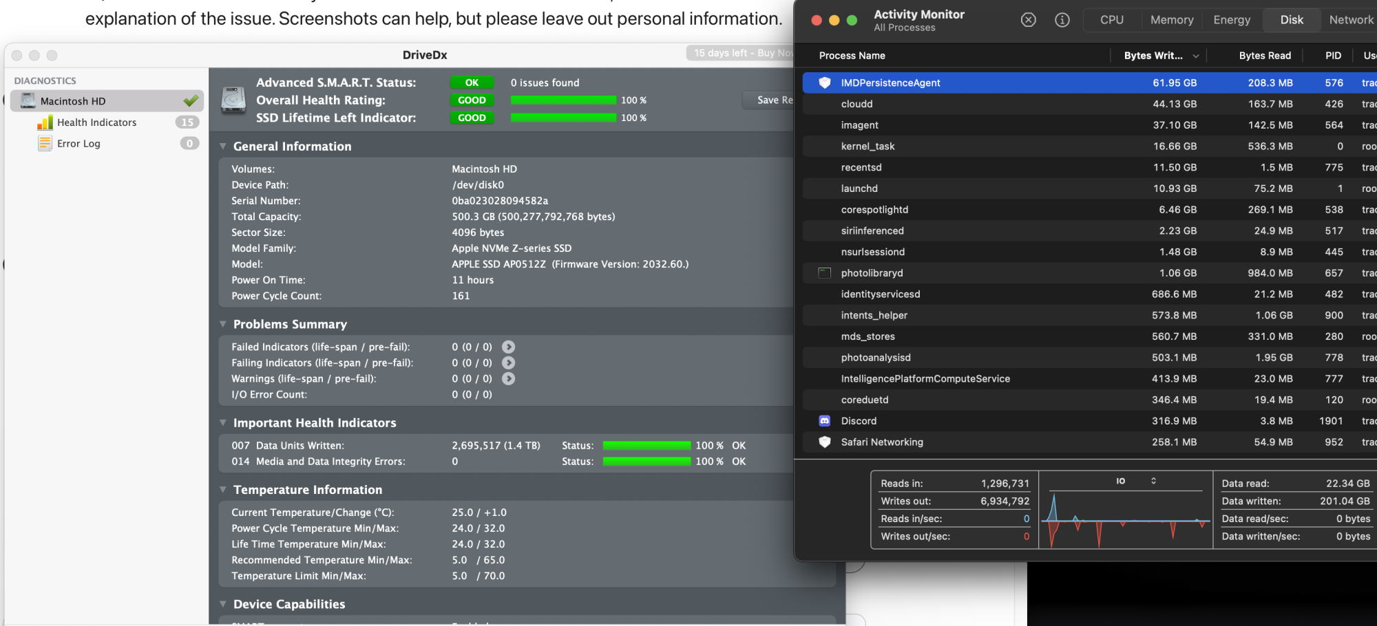 After setting up my Mac, probably just me but I like to make sure everything is running correctly so I went into activity monitor and checked CPU and Memory which all looks ok. However then looking at Disk, I found there was a huge amount of Data Written. Did not think anything much of it first as it was a new Mac and prob had a lot of AI bits and analysing photos from Icloud etc, however it just never stopped climbing. I then became concerned and opened a support ticket. Pretty much just got shrugged off as its fine but honestly the guy did not sound bothered or interested in helping me.