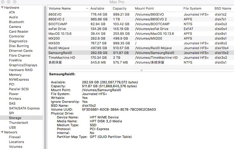 What video card are you using? I'm wondering because I was thinking of getting a Sapphire RX 580 but someone mentioned I'd have trouble fitting a HPT m.2 carrier above it in slot 2. Any space issue with your 7102 and video card?Today I replace my GPU to GT-120 and boot from MacOS Mojave boot drive, then installed SSD7101-A driver and reboot, my "HPT DISK 3_0 Media" raid0 disk becomes available.