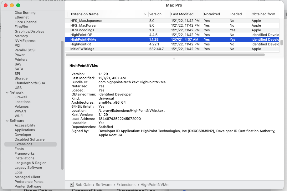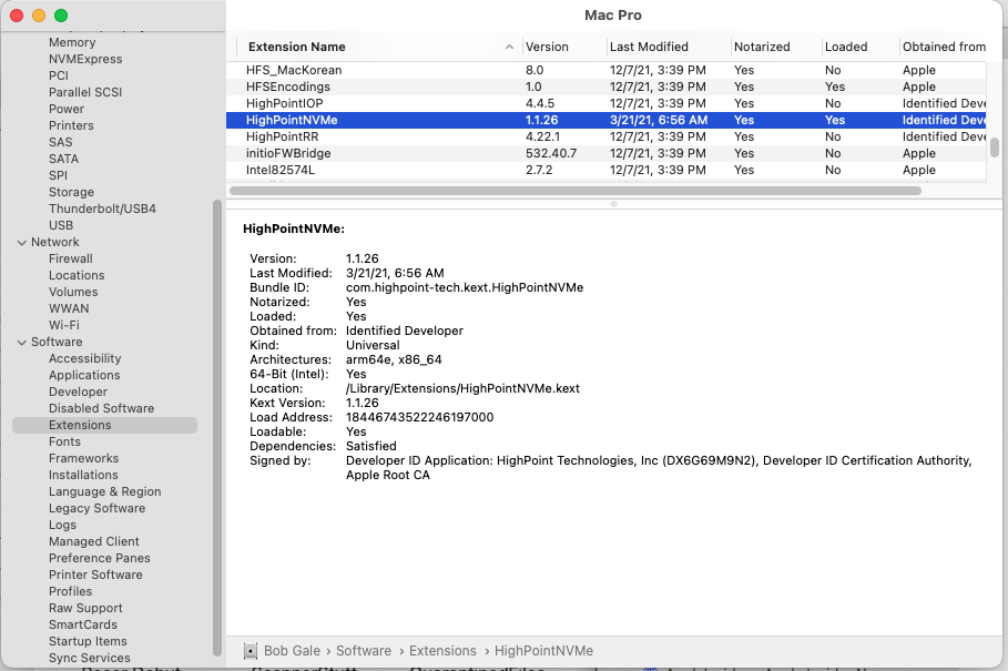 Hi @Bggale - I am having some difficulties I am wondering if verified the driver status.HighPoint driver v1.1.26 seems to be working fine with MacOS 12.1.