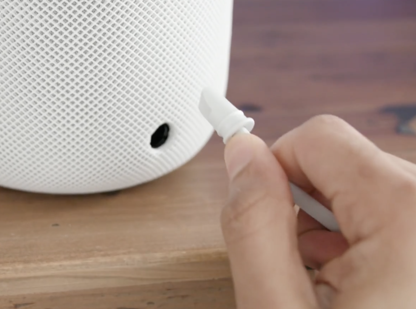 In the rare instance that the cable is detached or damaged, do not attempt to remove or plug it back into HomePod. If the cable is removed or impaired, damage could have occurred to the cable or the internal components of HomePod.”