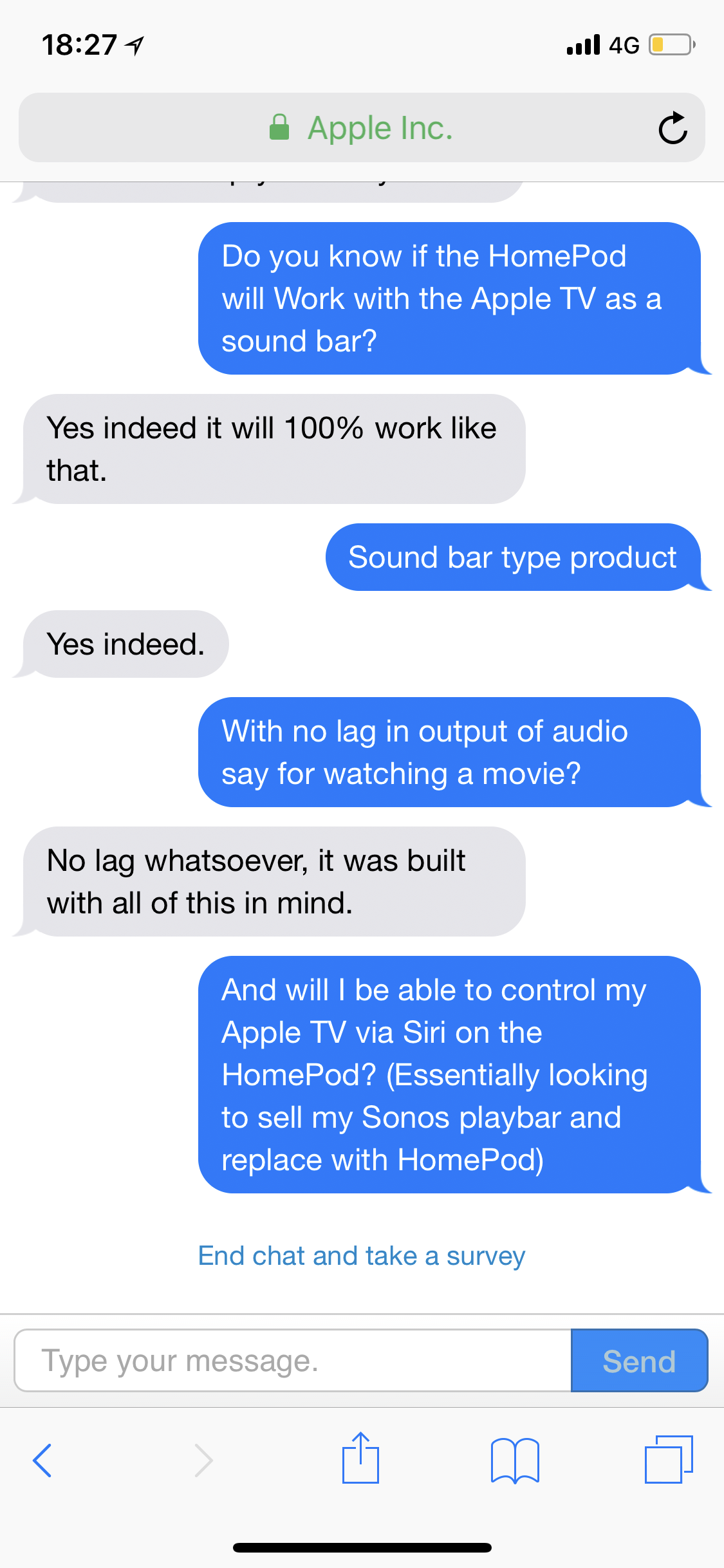 Are you really trying to replace your Playbar with a HomePod? It doesn’t even have a digital input let alone many other things. For music, I don’t know which will sound better since HomePod’s not out but there’s 0 chance HomePod will be a better solution for TV.View attachment 748200 According to a chat representative from Apple this is correct.