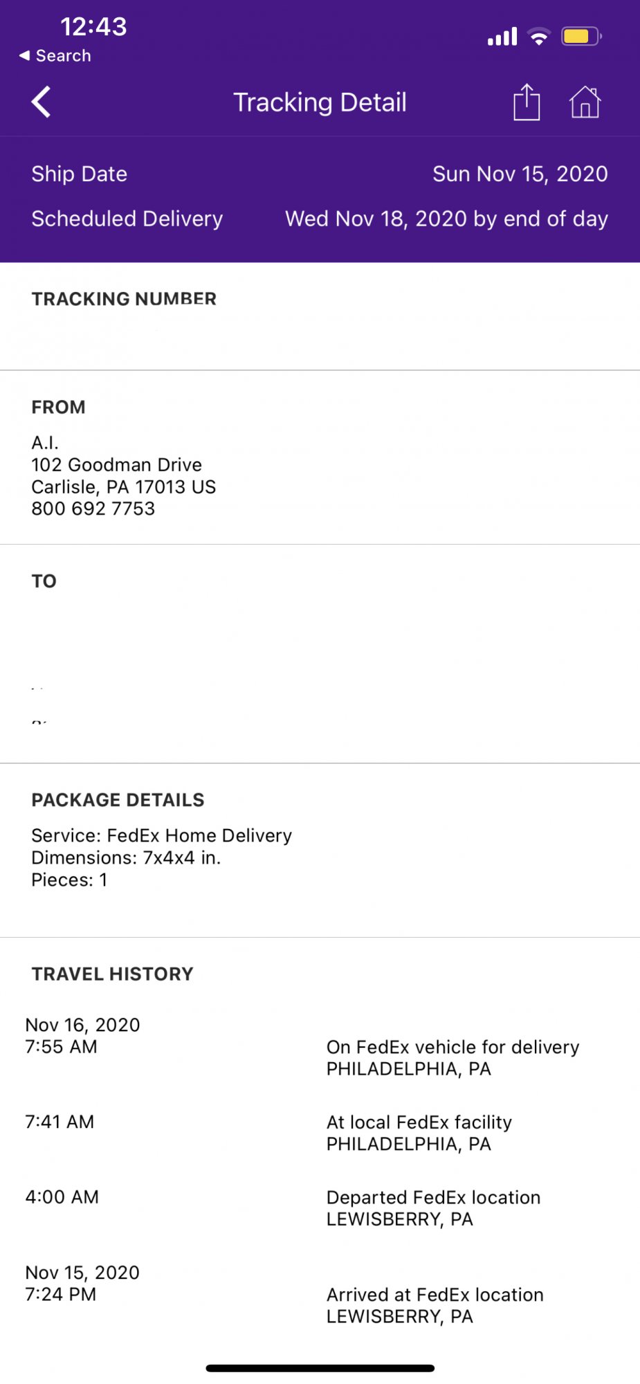 I did FedEx; should arrive tomorrow in New Orleans. Everything seems normal on my end.Anyone else order with Fedex? I chose standard not expedited (Nov 17-19 on Apple). Fedex app says by Wednesday November 18th but my tracking shows Out for delivery in Philadelphia since 7am today. Shipped from PA as well.