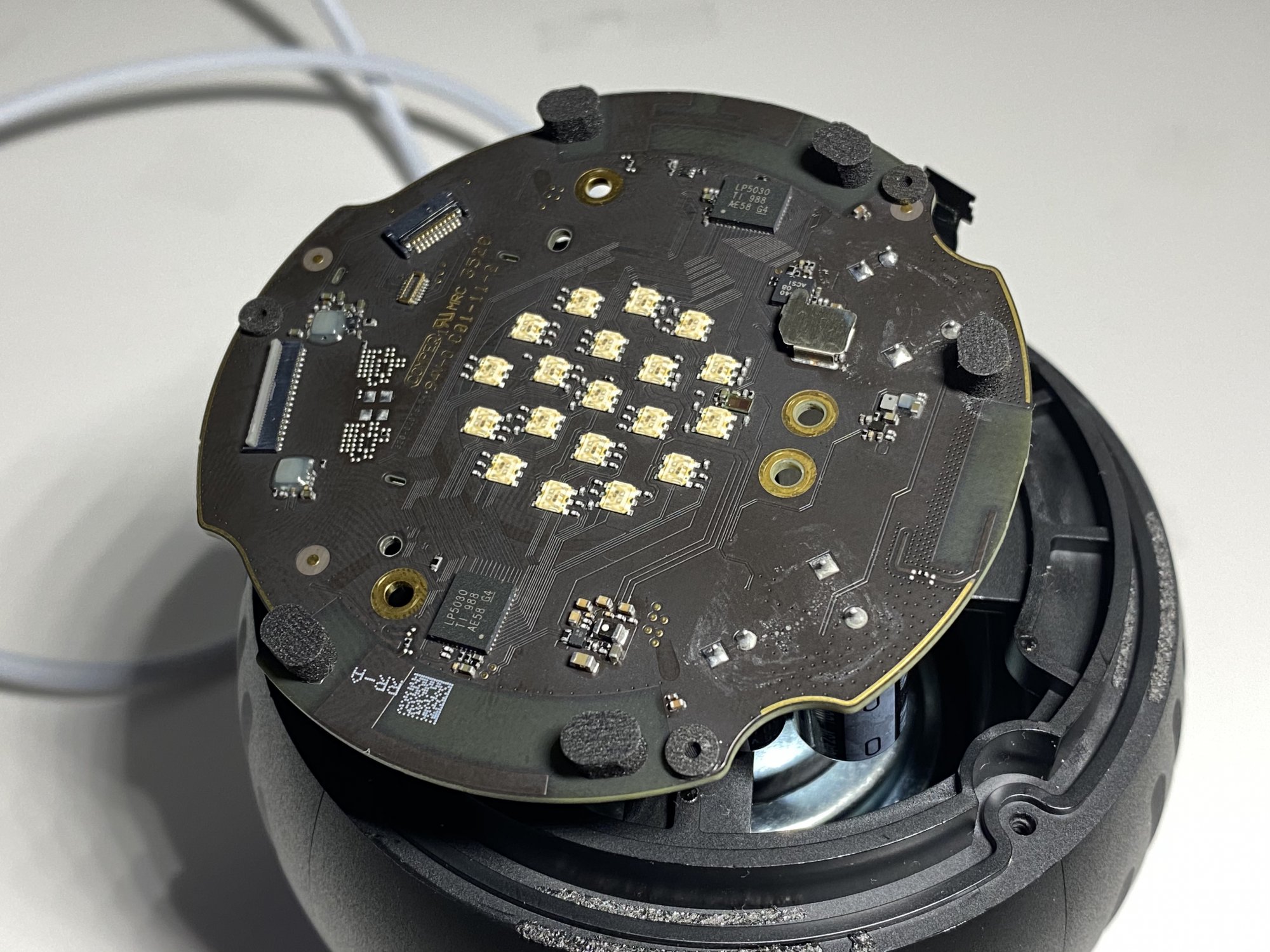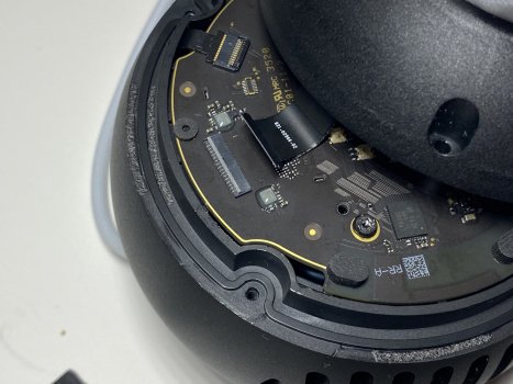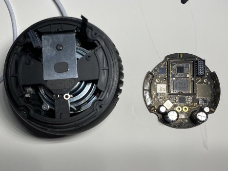 Using tweezers, CAREFULLY peel the microphone ribbon cable off of the sidewall. Lift out the speaker terminal rings. Now flip the HomePod Mini over and remove the 4 rubber screw covers on the bottom side, remove the 4 T6 screws. Bottom comes out (also held together with some moderate strength adhesive like the top half). You can remove the speaker driver by removing the 4 T6 screws (or removing 2, and loosening the other 2) Most of the markings on the NAND flash storage IC aren't readable as some of the markings on the processor
