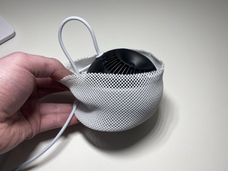 Let’s get to the fun part. The disassembly procedure is a bit different, and you need to be careful since the mesh doesn’t have long draw strings. You still open the HomePod Mini from the top, but you have to get in to the mesh first from the bottom. Do not try to remove the top plastic touch surface like in the original HomePod. Removing this is a great way to break it and isn't necessary for disassembly. Begin by removing the rubber circle, and then 3 T6 screws to remove a plastic disc plate. Then remove the bottom base T10 screw. Open up the mesh (there are tiny draw strings to be mindful of.. I will have to rethread mine) and pop the plastic grommet from around the power cord inlet.