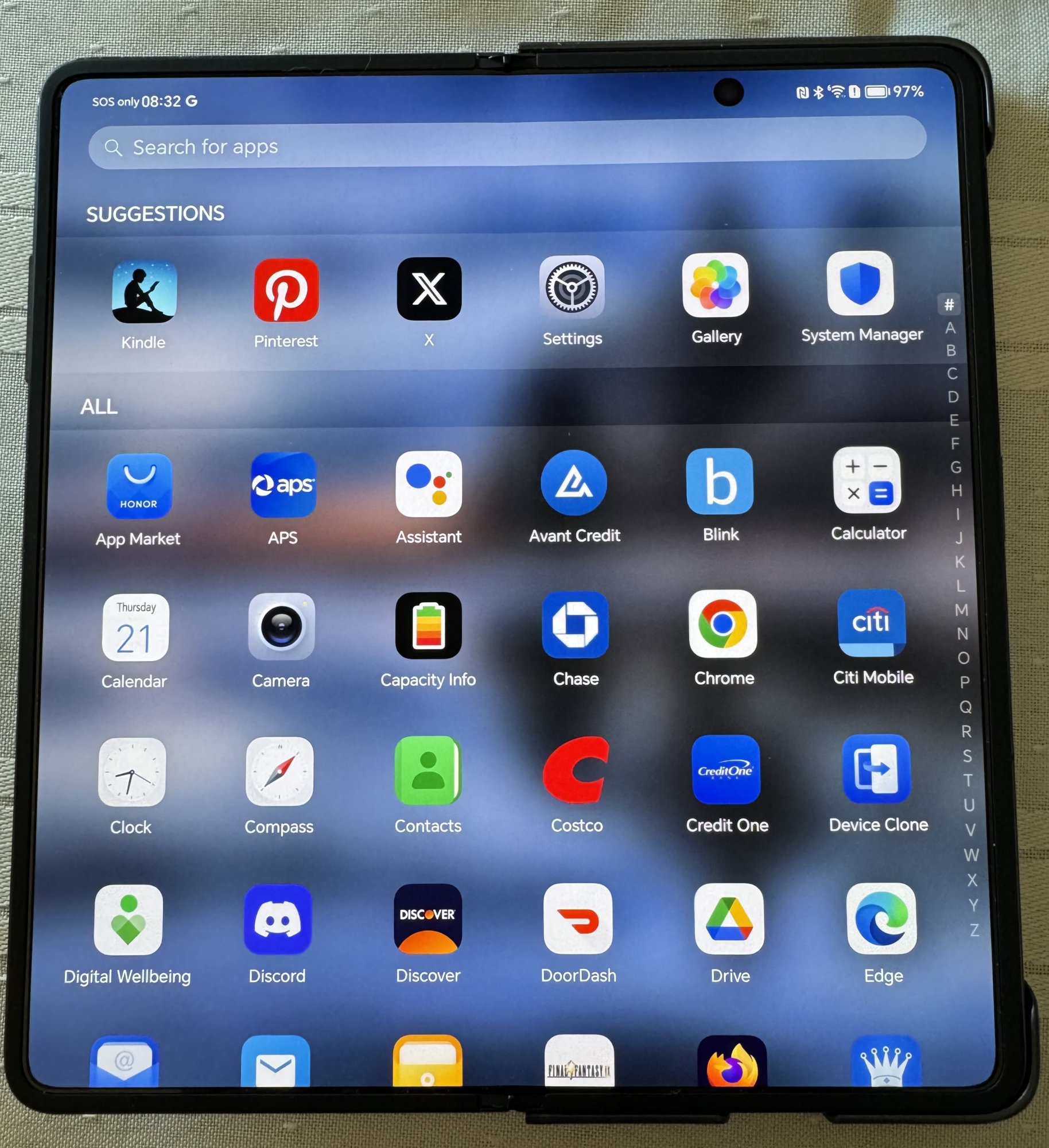 First impression - perfect hand size. The front facing screen is great, the folding action really smooth, and the inside screen also great. However … the software is an OMG! It looks like the illegitimate child of an iOS/Android breeding event. Not the nice features either. Okay… time to dive in and see what can be ”adjusted”. It does come with some bloat apps but all can be uninstalled (FB, Instagram, LI, TT, etc…). It does come with the Honor store installed but you get an access error here in the US. Since it comes with the full bevy of Google and can sideload this is not an issue. For security, the side fingerprint sensor (power button) works quick and flawless. Just putting your finger on it, if recorded, unlocks it. FaceID is good but has a hesitation. Will look to see what can be done to improve it.
