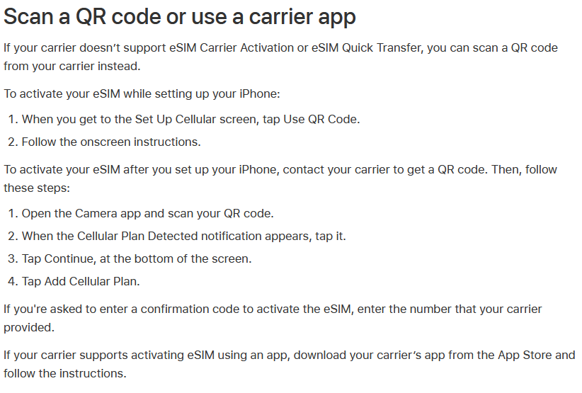 I am on the Consumer Cellular network and currently own an iPhone 12 Pro which has a physical SIMM card. Friday my new iPhone 15 Pro Max will be delivered and I will transfer my phone number and data to that phone. The iPhone 15 has an eSIMM and I'm not sure how and when I install it. I was told by Consumer Cellular to call them and they will send me a QR code in an e-mail to install the eSIMM. How do I do it and when. Is it done while I'm going through the setup routine in the beginning when I'm programing and entering data on my new phone using Quick Start? Or do I install the e SIMM after I run the new phone setup? It sounds like from the directions in Quick Start that programming the eSIMM is done during the initial programming of the phone. Has anybody installed an eSIMM using a QR code?