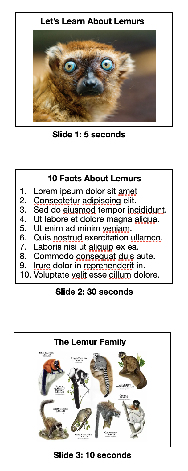 - Each slide needs to have its own individual display time. A slide with only a photo should be on-screen for only a few seconds (so people don't get bored), while a text-heavy slide needs to be on-screen for noticeably longer (so people have time to read the text).
