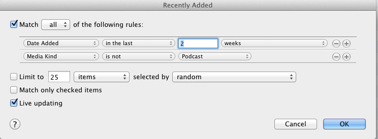 chaos86 macrumors 65816 Sep 11, 2003 1,006 7 127.0.0.1 May 8, 2013 #2 Make a new smart playlist with these settings: