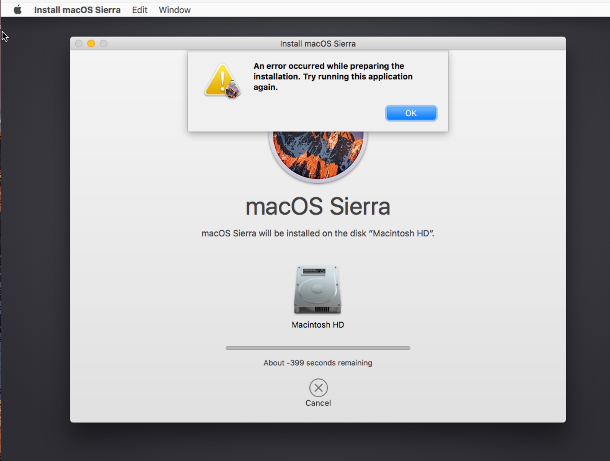 After churning away for about six hours it failed with the message: Operation failed with status 49168