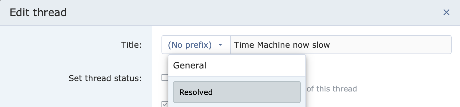 "Change the drop-down in front of the thread title to Resolved." -> if I click "Edit thread" (Edit Title has been replaced) It doesn't show any "drop-down in front of the thread title". Image attached.