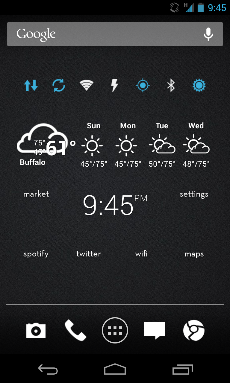 I like simple and clean. Widgets are on other screens (Evernote, SoundHound, etc) as are folders. I have a single row along the bottom of every screen to follow the clean lines look.