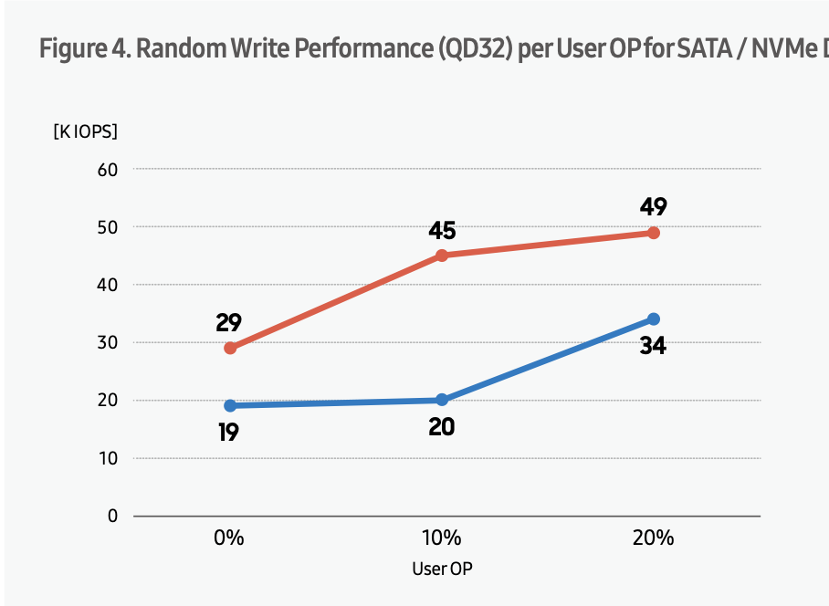 As the cart below shows you can get 60% better performance with 20% vs 0% provisioning. The colored lines are for different SSDs.