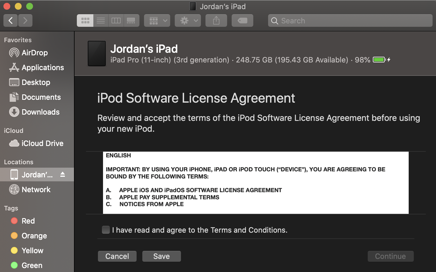 I hit continue and it just takes me to this screen and the iPad is ejected from the sidebar:
