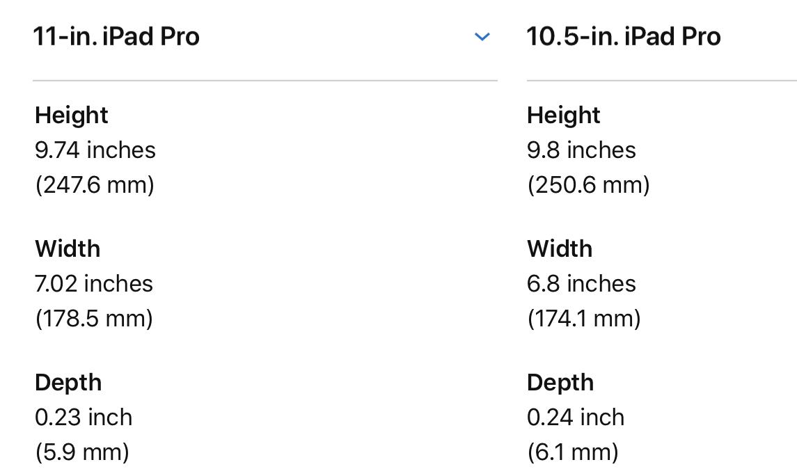 Sorry, I got them backwards. The longer edge is shorter, the shorter edge is longer.Just to confirm - while being held in portrait the 11” Pro looks to be slightly wider than the 10.5”, but the 10.5” is slightly shorter?