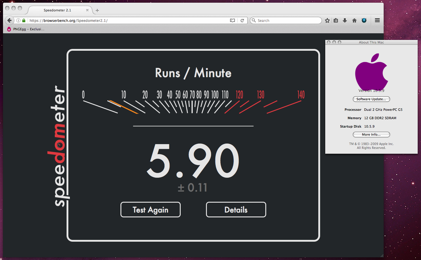 This is through InterwebPPC on a dualcore 2ghz PMG5. Now compared to my win10 box, it scored 171.![]()
