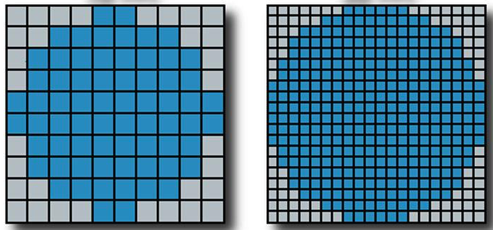 Here's an example using 2x scaling to keep things simple. The image on the left is how a 10-pixel wide circle would appear on a native 1080p/1440p display, and the image on the right is how the same circle would appear on a 4K/5K display that "looks like" 1080p/1440p.