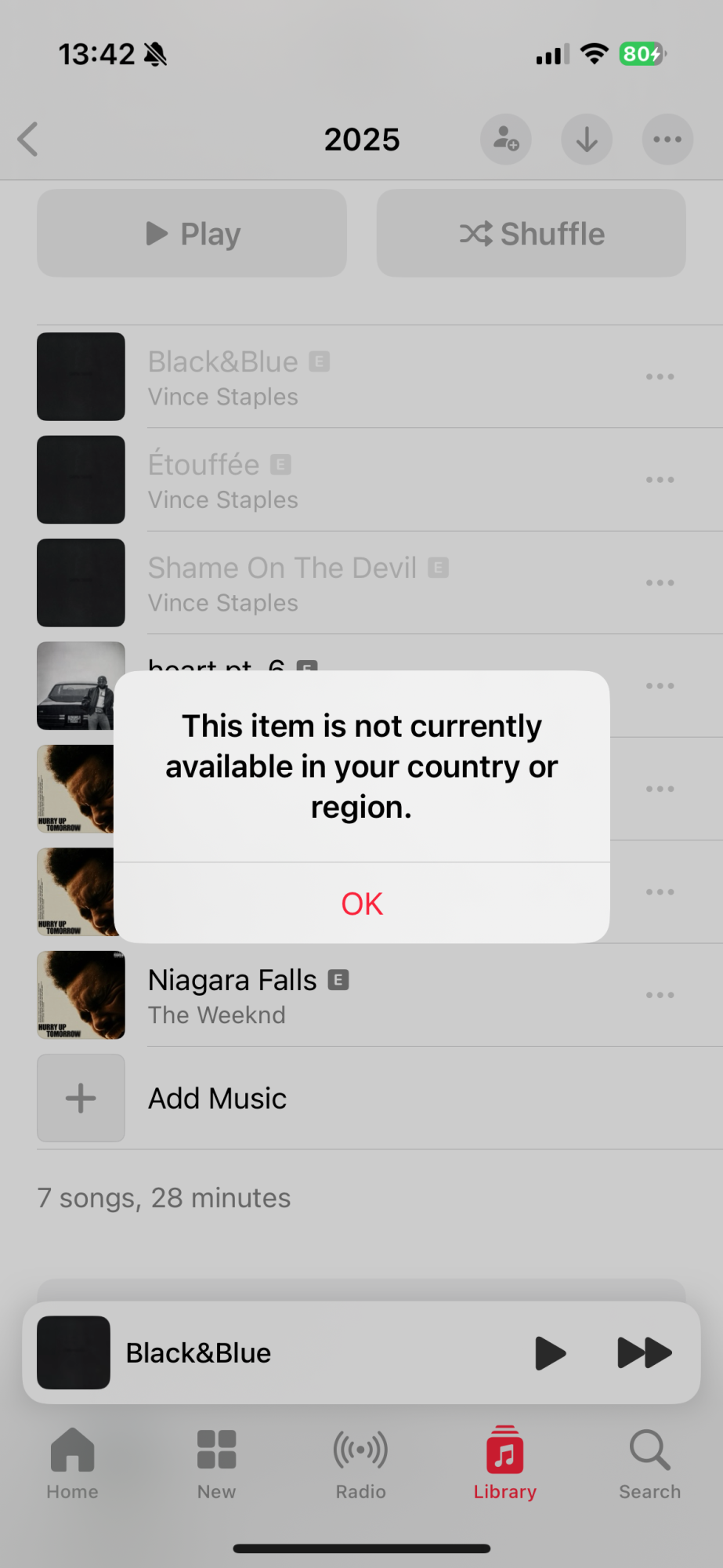 That’s so weird. I’ve never ran into that bug. It’s only with playlists? Maybe that’s why I haven’t ran into it.It isn't, that's exactly the point, I can go to the album and stream it (see below). It's one of the many bugs that exist when trying to create playlists.