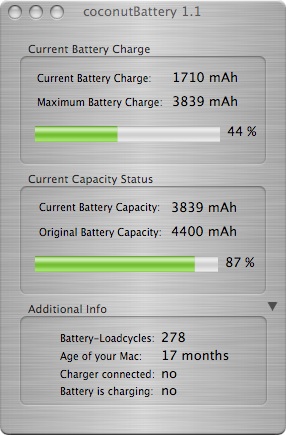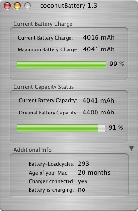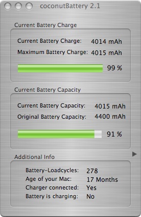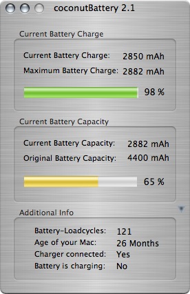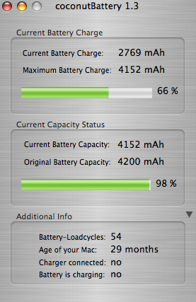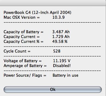 My 14" iBook battery is 26 months old (original) and I've used 196 charge cycles. It has 3% of it's charge left... quite depressing.