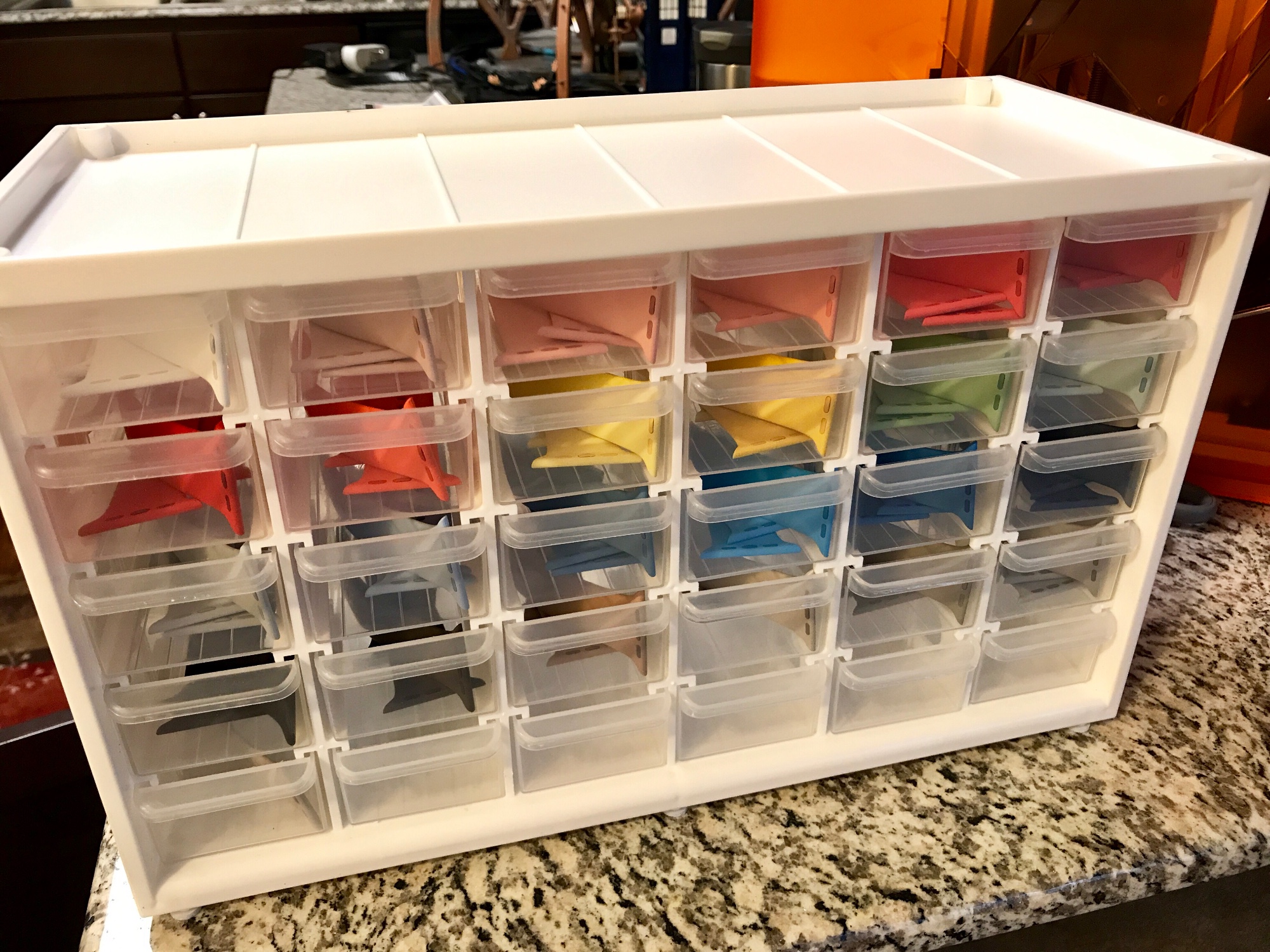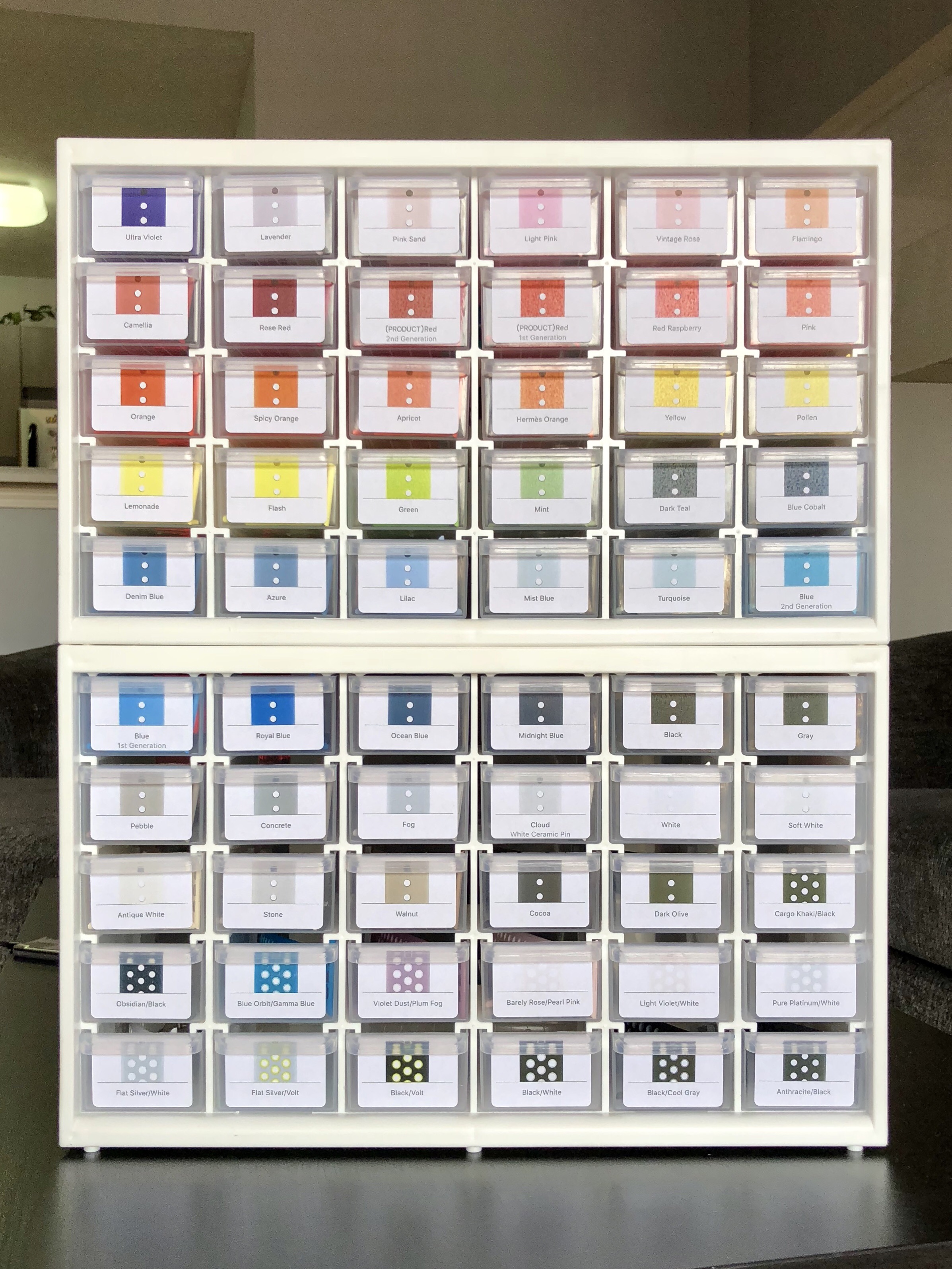 15x6x9”. 30 drawers. I started out with one and continued collecting the colors I’d previously missed.