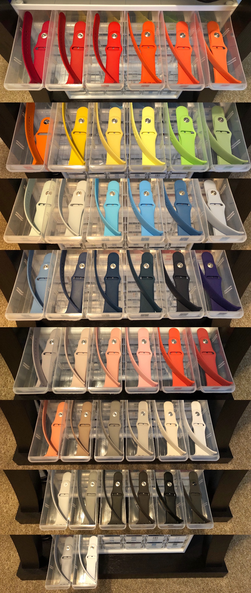 62. Every OEM Sport and Nike Sport band Apple has made so far. (Two bands [Pure Platinum/Black and Light Bone/Black] not pictured...need to begin a third storage bin.)