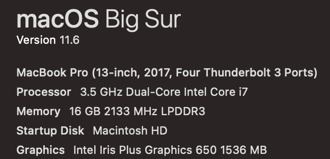 Current MacBook Pro: 2017 13", 4 Thunderbolt 3 ports, 3.5ghz dual core Intel Core i7, 16GB RAM, 512GB storage, Intel Iris Plus Graphics 650 1536MB. Everything works perfect, cosmetically almost perfect since its been covered in a vinyl wrap its whole life.