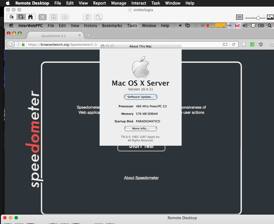 It was (and remains) my test bed for assessing what builds on the G3 architecture (e.g., macports, which was building gcc7 at the time of the above screen cap, via Remote Desktop); what runs; and assessing what it absolutely cannot do well at its (current) clock speed with (current) PowerPC projects still kicking about (like the above-displayed Speedometer 2.1, which seems to freeze the script built into the bench test about 19 tests into the 480). It also has a 32-bit built of Debian_sid on there, though I haven’t done much with it for a couple of years.