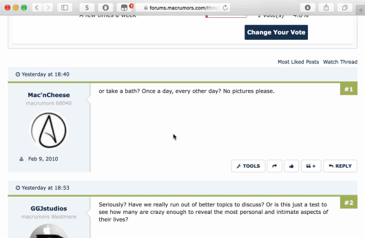 It’s a voluntary poll in a public forum. Your privacy isn’t being invaded. You have the choice to avoid the thread entirely. That’s the beauty of choice. Some rather interesting posts have come from a rather mundane poll, so I don’t find it entirely pointless. I’m honestly a little confused at the effort in which people put forth to find offense in something. I don’t think this poll has some dark motives for personal gain. And even if it did ... it’s a poll about showering.Indeed.
