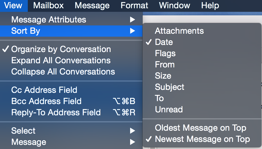T telecarver1 macrumors newbie Original poster Jan 10, 2010 18 0 Jul 28, 2015 #3 Kissmyne said: Although OS X versions differ between you and me, the placement is the same/similar. From menu>View attachment 571566 From Message List> View attachment 571567 From Message List(Classic Layout)*Requires Secondary click*> View attachment 571568 I hope this helps. Click to expand... Thanks! I don't know how I missed this. Duh! I thought I had searched through every command.