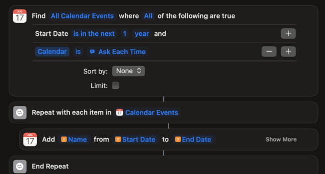 If this can't be done in Calendar app, Im looking for help with Automator or Shortcut's to maybe do this. Thanks!