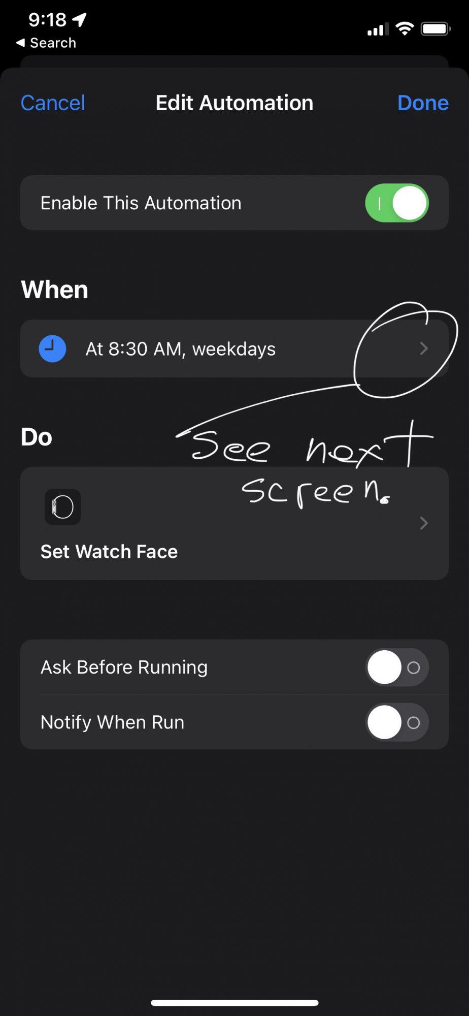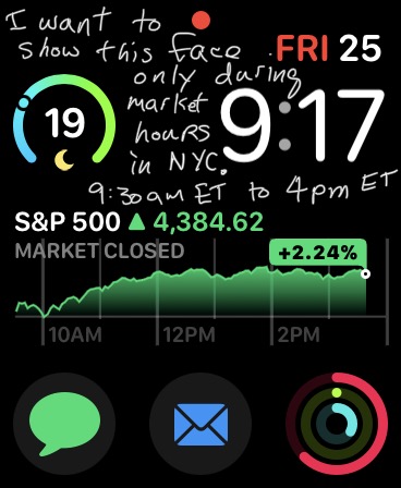 My use-case is that I want to change to a particular watch face that shows a daily stock market chart for the S&P 500 ONLY while the market is open in New York City.....9:30am ET to 4pm ET. I don't live in that timezone and occasionally travel between two timezones and want to see the daily chart ONLY when the NCY market is open....regardless of where I am. This of course is using the Apple Stocks App on my Watch. See the pics below of my watch face and the two screens in the Automation part of Shortcuts on my iPhone used to change to this watch face when the market opens -- 9:30am ET. Also, when the market closes, I revert to another watch face -- at 4:30pm ET!