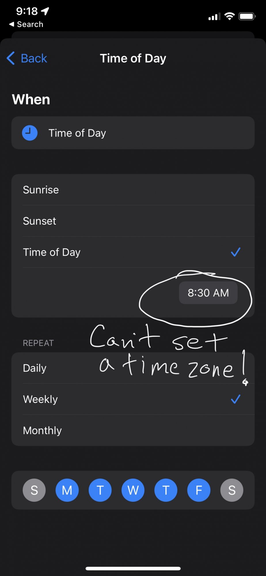 Sorry for my confusion. What I meant was that if I setup an Automation in Shortcuts to set a new watch face on my Apple Watch at a particular time, how can I add a timezone to this designated time--the Automation set-up screen only shows the time without a timezone picker.