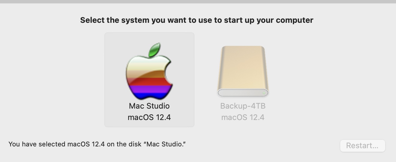 After updating from a 2009 Mac Pro to a Studio Max, I just tried to reboot my new Studio Max from an external SSD clone and was quickly reminded that that doesn't work, as the external SSD clone doesn't show up in the "startup disks" listing.